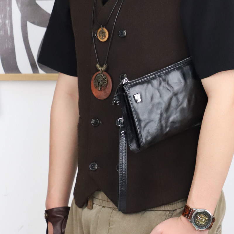 这款复古手工褶皱植鞣皮手包,精选优质头层牛皮打造,纹理自然,质感醇厚。采用传统植鞣工艺,随使用时间推移愈发温润,呈现独特复古韵味。手工褶皱设计别具匠心,兼具艺术感与实用性,彰显男士低调品味。长款拉链结构安全便捷,内部空间充裕,可轻松收纳卡片、现金及手机等随身物品。兼具皮夹与手拿包功能,休闲百搭,适合日常通勤或出行搭配。每一处细节都体现匠心工艺,是追求质感与风格的现代男士的理想之选,复古潮流中不失实用与格调。