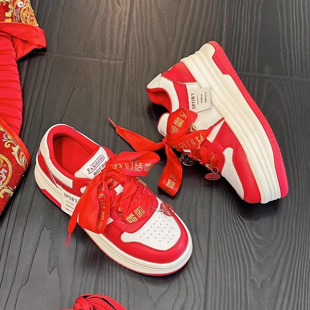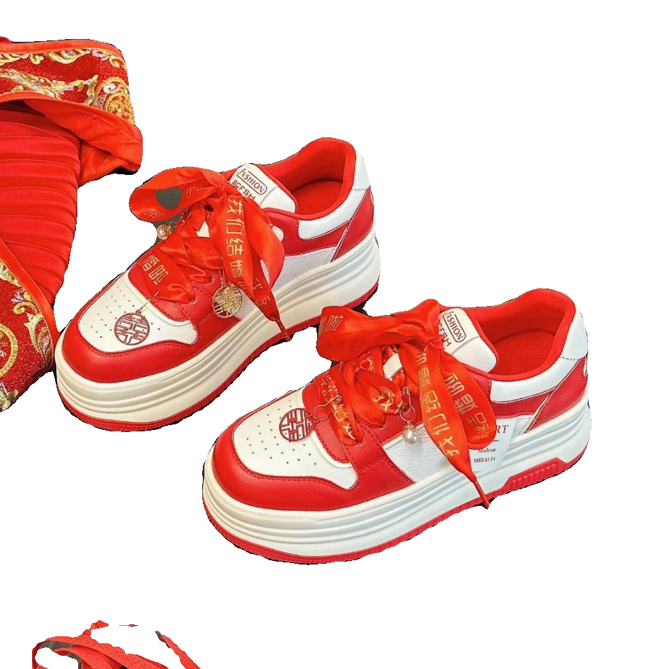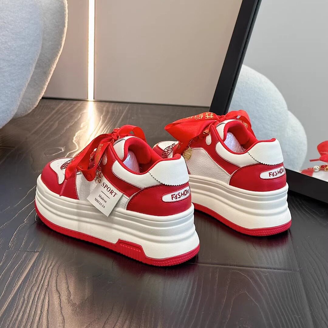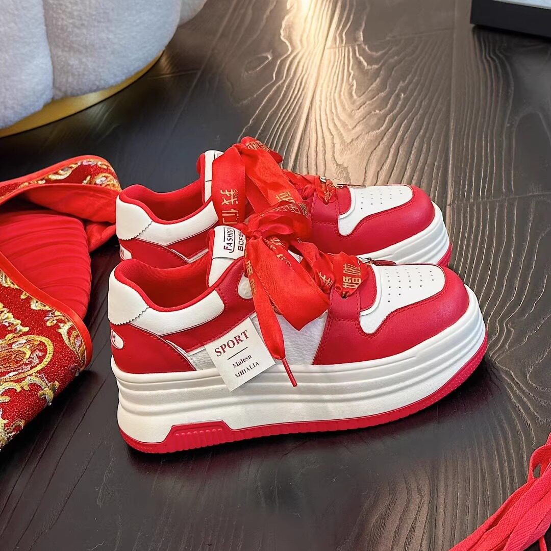 淘宝红色运动休闲鞋女真皮厚底新娘婚鞋2025春秋新款韩版百搭松糕鞋潮