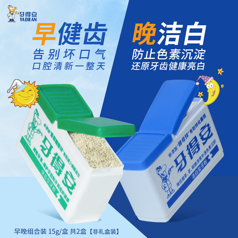牙得安刷牙粉美牙健齿套装,专为呵护口腔健康而设计。早晚安双效搭配,深层清洁牙渍,温和洗白牙齿,帮助恢复自然亮白。富含天然矿物精华与护龈成分,有效抑制牙菌斑,减少牙龈出血,强健牙根,稳固牙齿。细腻粉末质地,深入牙缝,去除口臭,持久清新。长期使用可改善牙周环境,预防龋齿与牙周病,实现全面口腔护理。无刺激配方,适合敏感人群,早晚各一次,轻松拥有健康洁白笑容。牙得安,守护每一颗牙齿,从清晨到夜晚,给你安心好牙口。