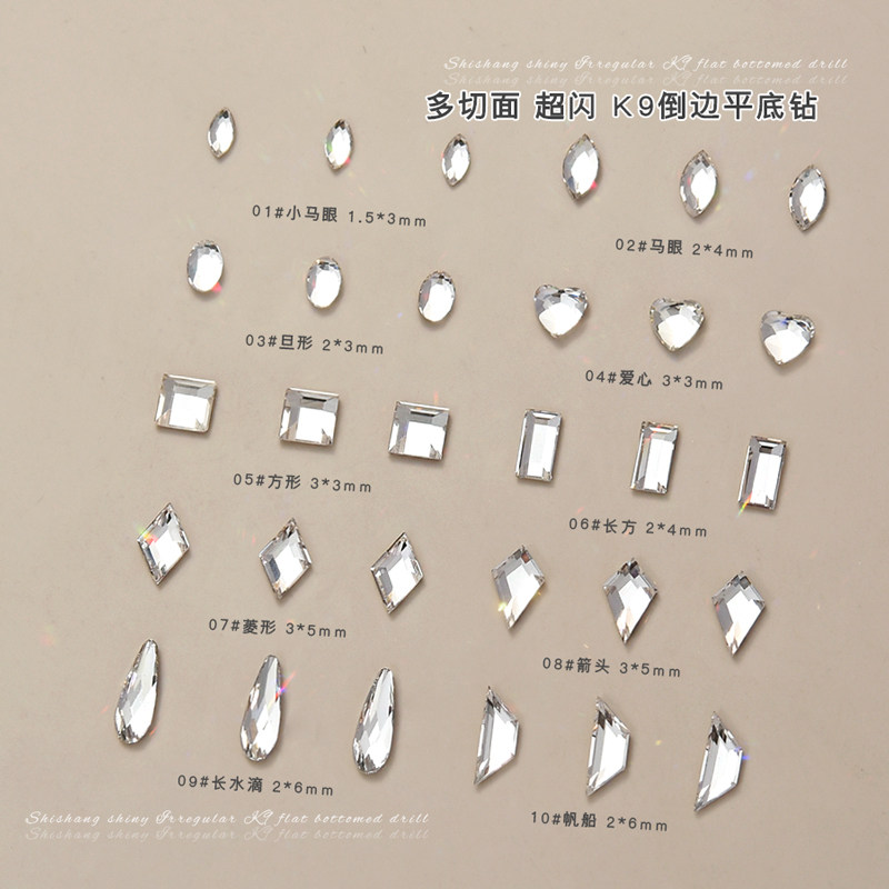 淘宝华子切K9倒边平底钻美甲饰品爆闪透白马眼菱形爱心水滴帆船异形钻