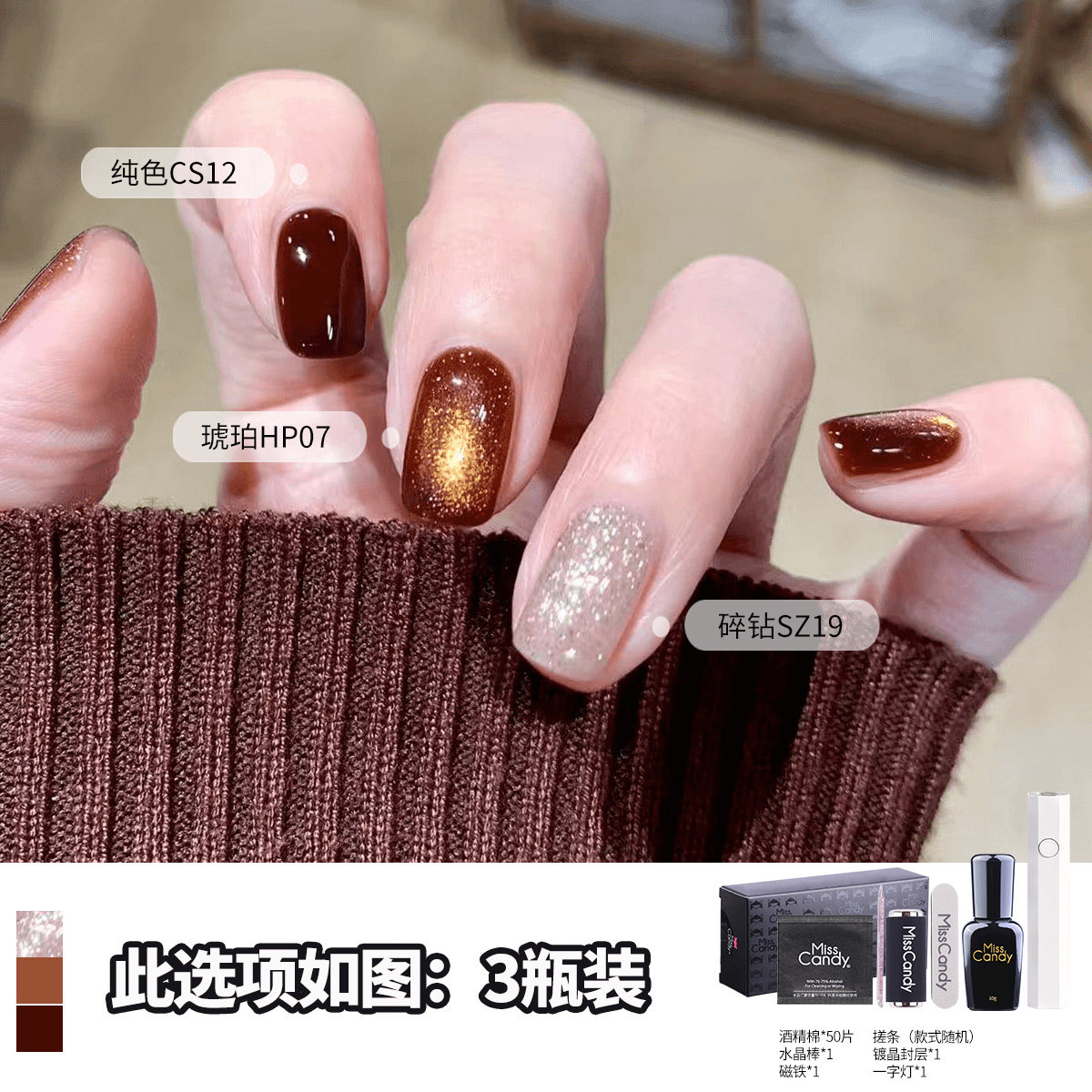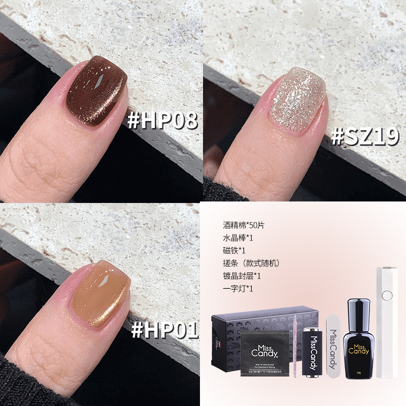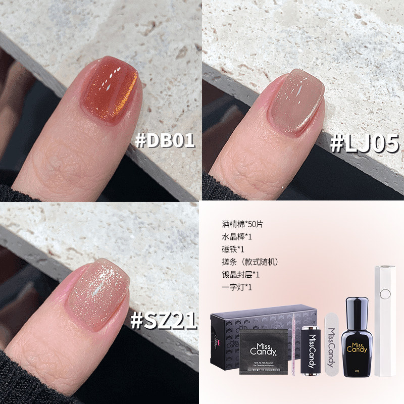 MissCandy甲油胶五合一猫眼一步胶2026年新款,专为懒人美甲店及高效美甲师打造。集底胶、色胶、猫眼胶、封层胶与加固胶五效于一体,真正实现“一步成型”,大幅节省操作时间。采用创新磁感猫眼技术,无需复杂手法即可呈现立体炫光效果。3瓶装套装设计,色彩丰富,满足不同风格需求。产品质地顺滑易涂,固化快、附着力强,持久亮泽不脱落。低气味配方,安全环保,呵护指甲健康。无论是日常快美还是专业沙龙,都能轻松打造高级猫眼美甲,提升服务效率与顾客满意度,是现代美甲店的必备之选。