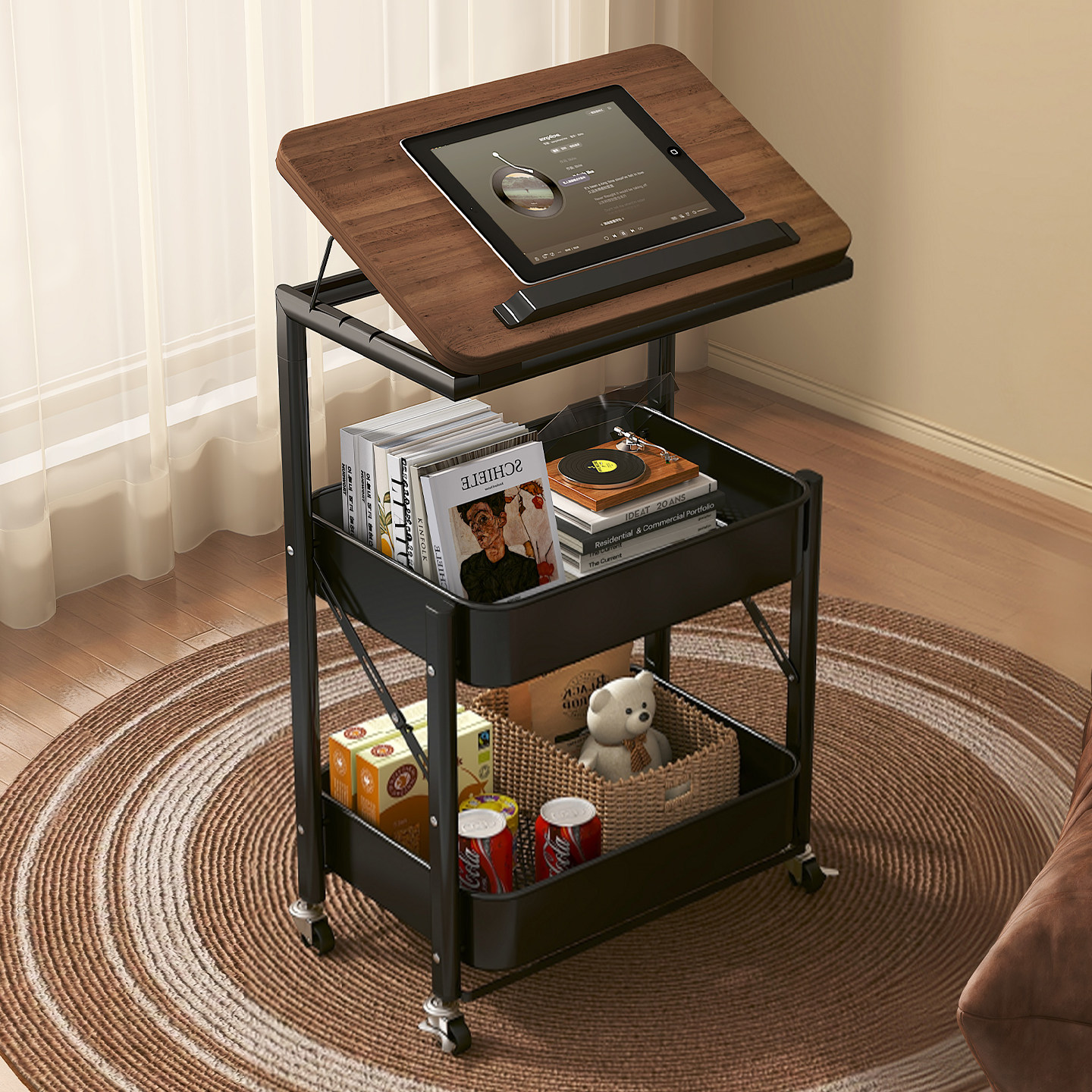 这款中古折叠零食置物架,集实用与美观于一体,适合客厅、卧室、书房等多种空间。采用复古设计,质感温润,搭配金属支架,稳固耐用。多层开放式结构,可轻松收纳零食、饮品、书籍、化妆品等小物,满足日常收纳需求。底部带万向轮,移动灵活,轻松推拉至沙发旁或床头,秒变移动边几或床头柜。折叠设计节省空间,不用时可收拢靠墙,特别适合小户型。无论是作为零食车、收纳架还是临时茶几,都能提升生活便利性与空间美感,是现代家居的理想多功能家具。