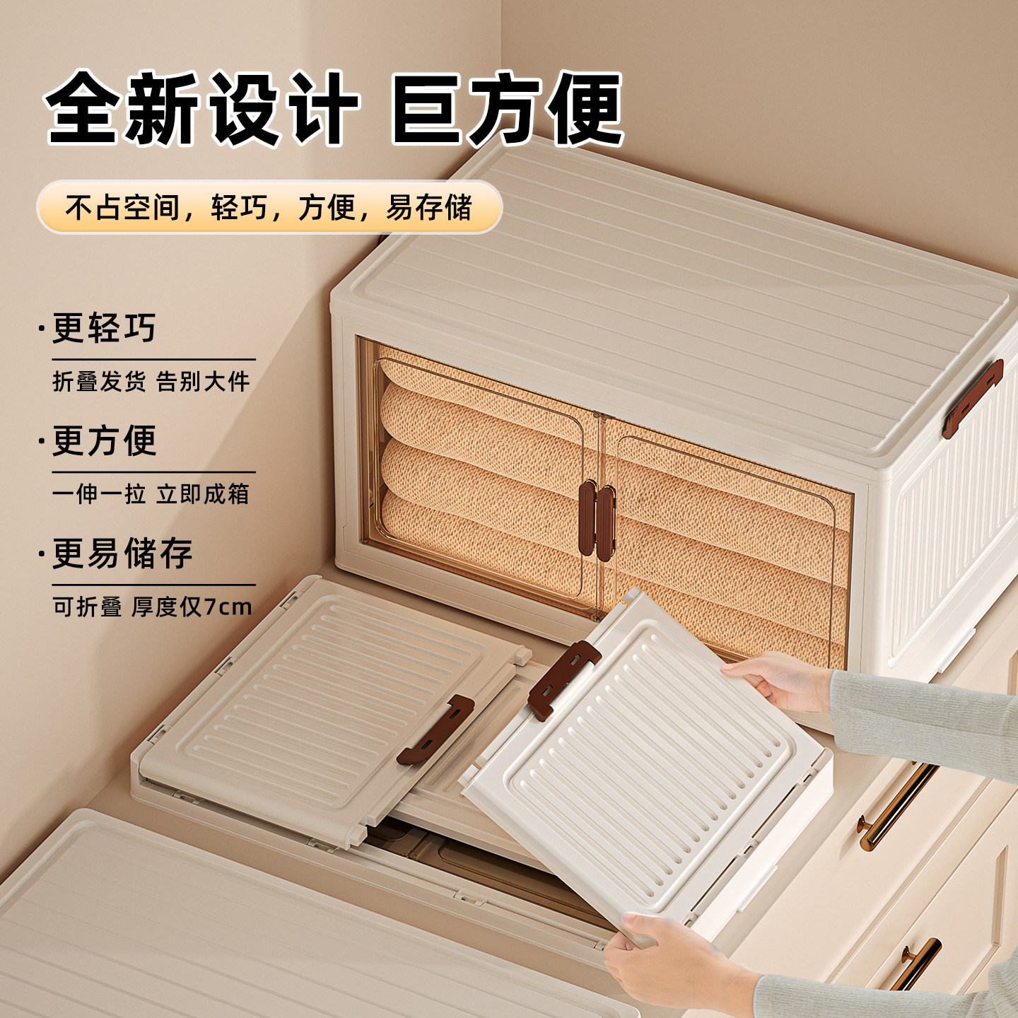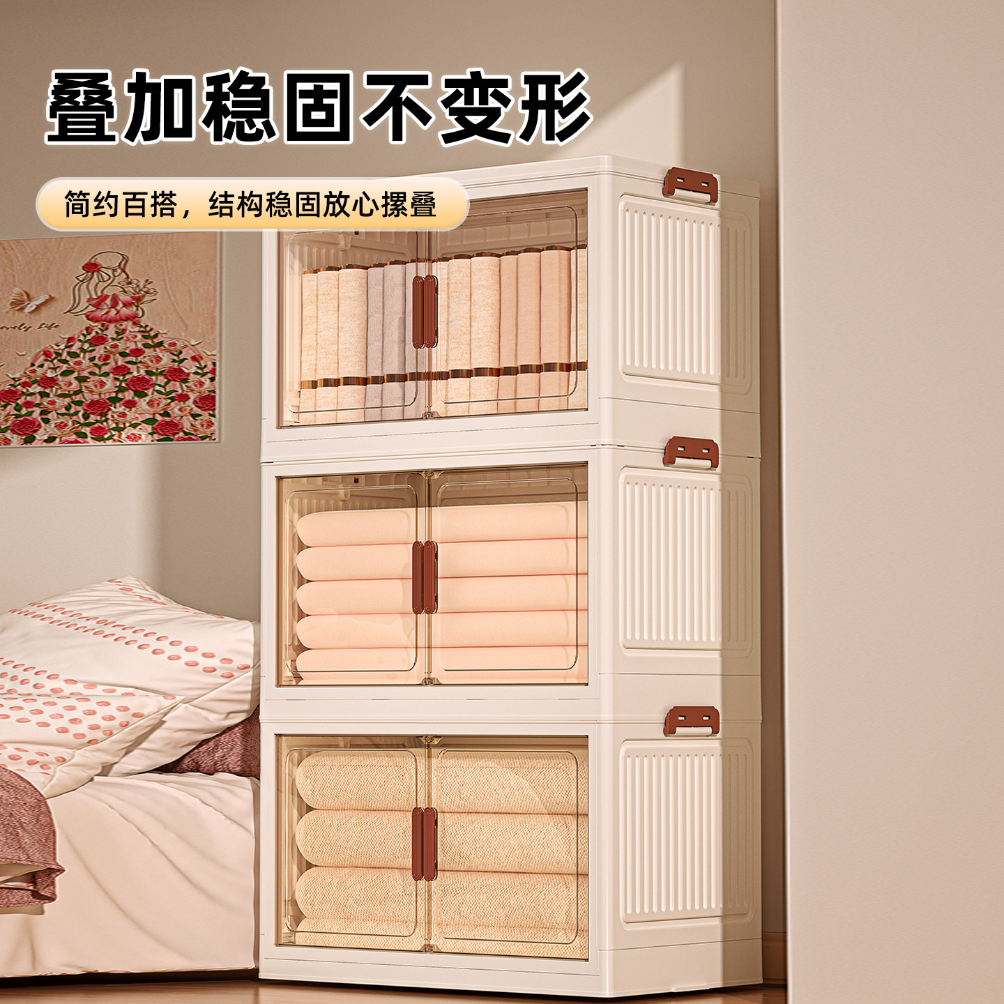 这款出口日本的家用大容量可折叠多层储物柜,专为高效收纳衣物、被子等家居用品设计。采用优质环保面料与坚固钢架结构,承重力强,耐用防潮。多层分隔设计,分类收纳更整洁,顶部可放置常用物品,提升空间利用率。不用时可轻松折叠,节省存放空间,搬家或换季收纳尤为便捷。简约日系风格,外观雅致,适配各种家居环境。无论是衣柜整理、卧室收纳,还是儿童房玩具归置,都能轻松应对。大容量设计满足家庭储物需求,是您提升居家整洁度的理想之选。
