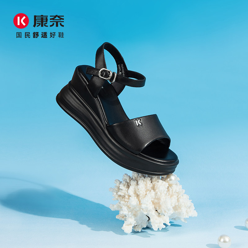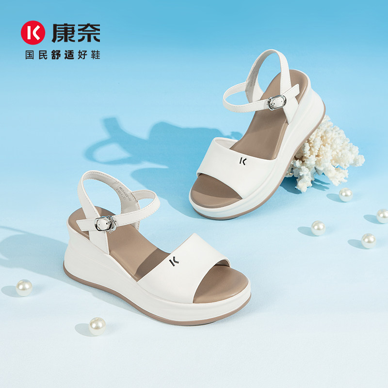 天猫康奈头层牛皮凉鞋2025夏季新款时尚百搭坡跟舒适轻便休闲外穿女鞋
