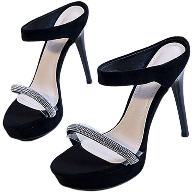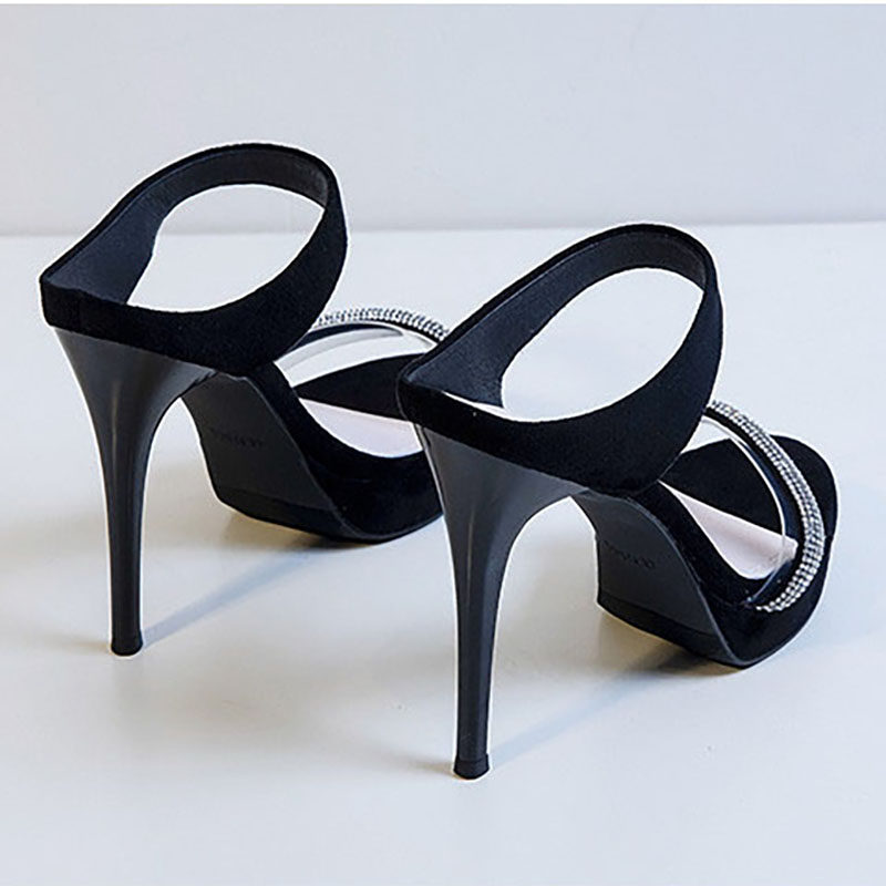 2025年新款夏网红性感细跟高跟鞋百搭露趾黑色真皮一字带凉鞋女