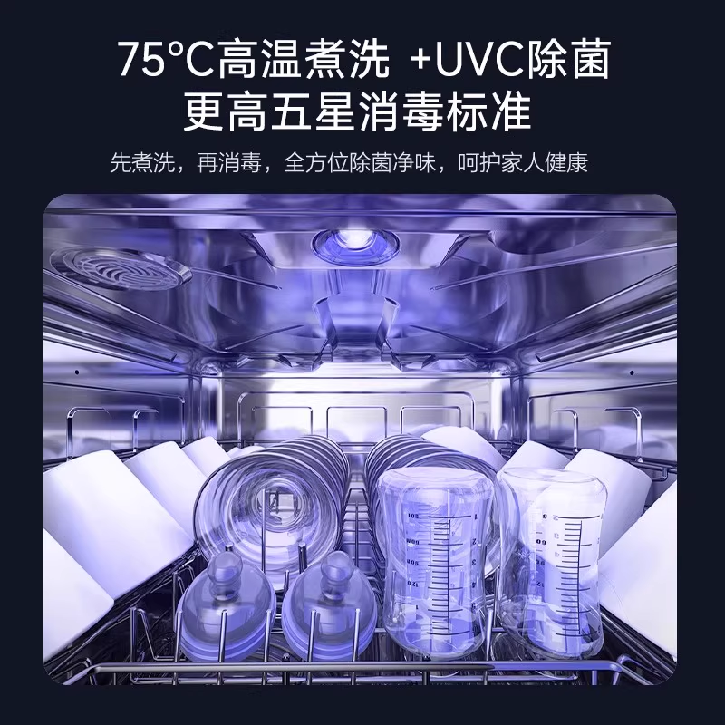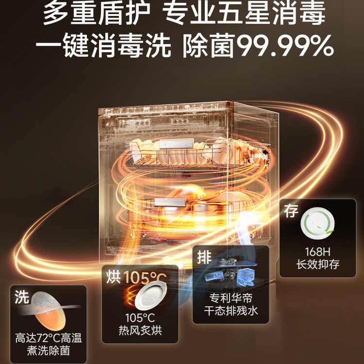 华帝16套小型家用全自动消毒柜一体嵌入式台式两用洗碗机,集洗涤、烘干、消毒与存储于一体,满足多口之家的餐具清洁需求。采用高温高压喷淋系统,深层去污,配合UV紫外线+高温双重消毒,有效杀灭细菌,守护家人健康。16套大容量设计,可轻松容纳锅碗瓢盆,灵活分层摆放更省空间。支持嵌入式与台式两用安装,适配不同厨房格局。智能感应油污,自动匹配洗涤程序,节能省水。内置热风循环烘干,餐具干爽无异味,兼具消毒柜功能,实现洗存一体。华帝洗碗机以高效洁净与智能便捷,提升现代厨房生活品质。