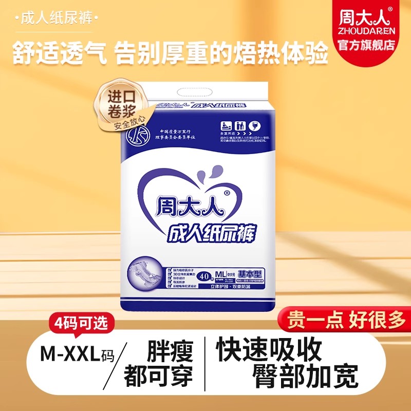 周大人成人纸尿裤是专为老年人设计的成人拉拉裤,采用搭扣式设计,易于穿脱,方便快捷。针对老年人需求,提供大码和中大码选择,适合不同体型。产品特点在于高质量材料,柔软舒适,透气性强,有效防止尿液渗透,保持干爽舒适的状态。该商品适用于男女老年人使用,是老年尿不湿的理想选择,让老年人在日常生活中更加轻松自如。