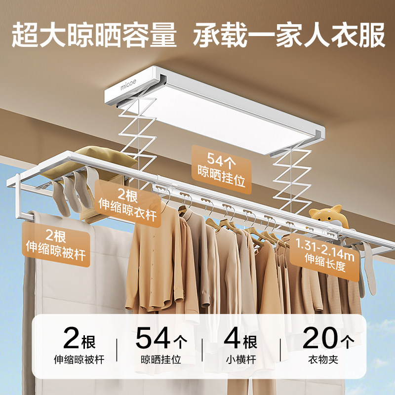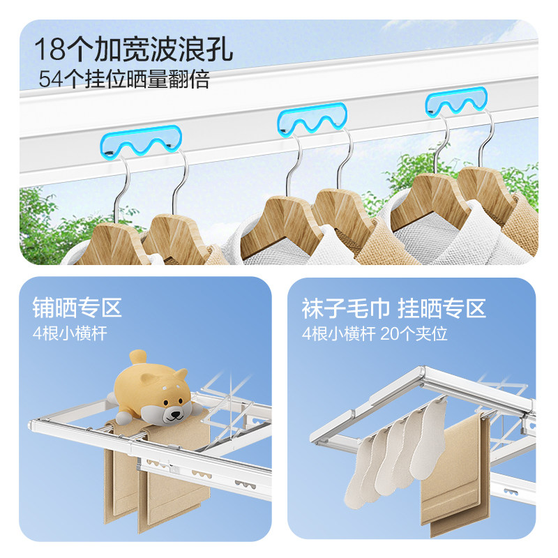四季沐歌电动晾衣架是一款集智能声控、遥控升降于一体的阳台晾晒神器,支持天猫精灵、小度等主流智能音箱语音操控,解放双手,晾晒更便捷。采用高强度铝合金材质,承重强、防锈耐用,配备LED照明灯,夜晚晾晒也清晰明亮。智能遇阻即停、过载保护等安全设计,使用更安心。同时,产品享受政府节能补贴政策,购买可获相应补贴,性价比极高。无论是新房装修还是旧居升级,四季沐歌电动晾衣架都能提升居家生活品质,让晾晒变得轻松高效,是现代智慧家庭的理想之选。