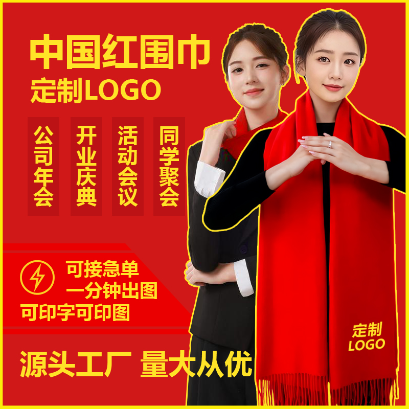 淘中国红年会定制logo红围巾男女寿庆活动开业庆典同学聚会刺绣印字
