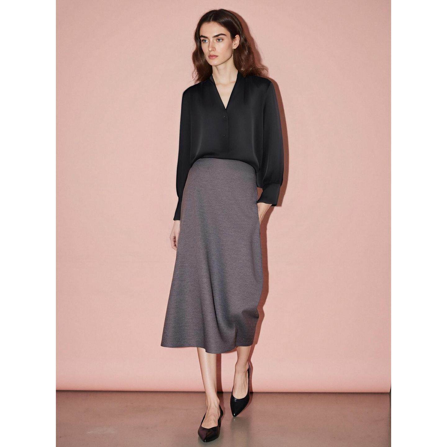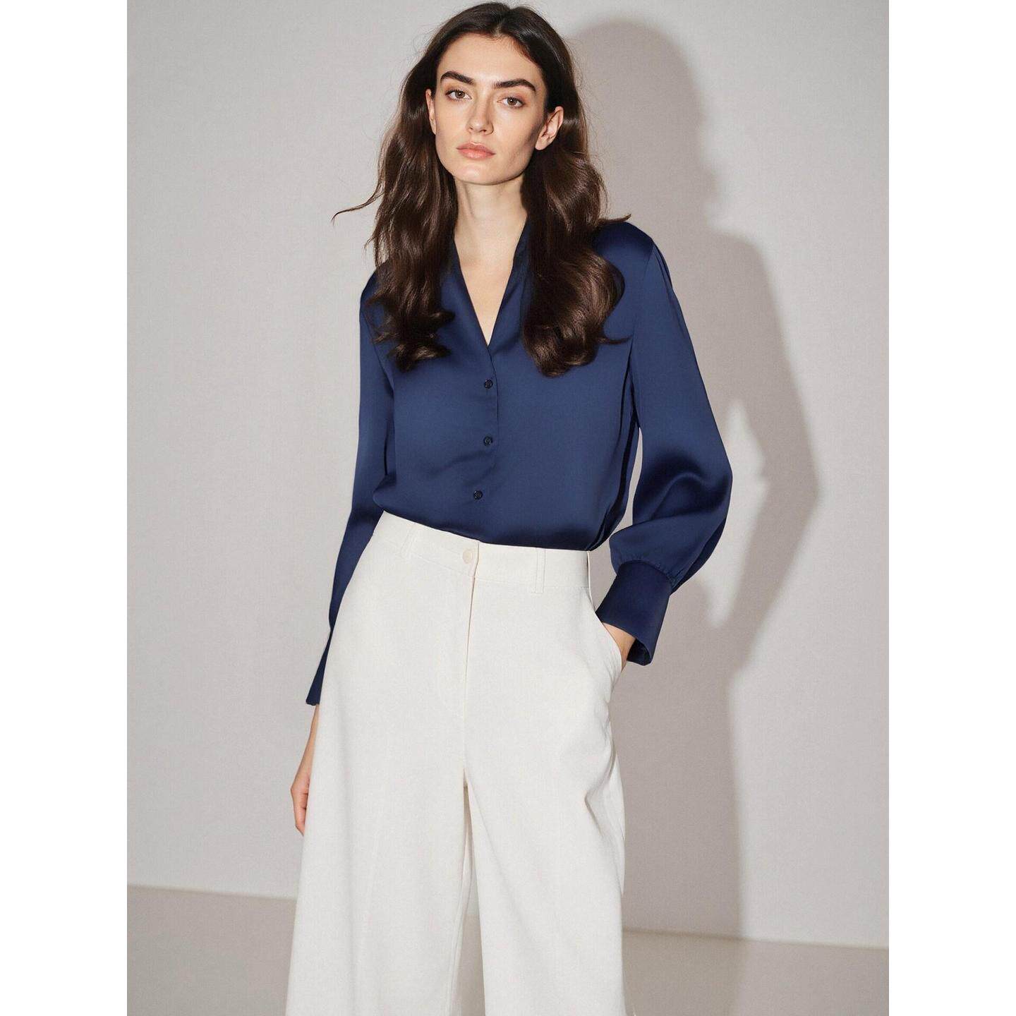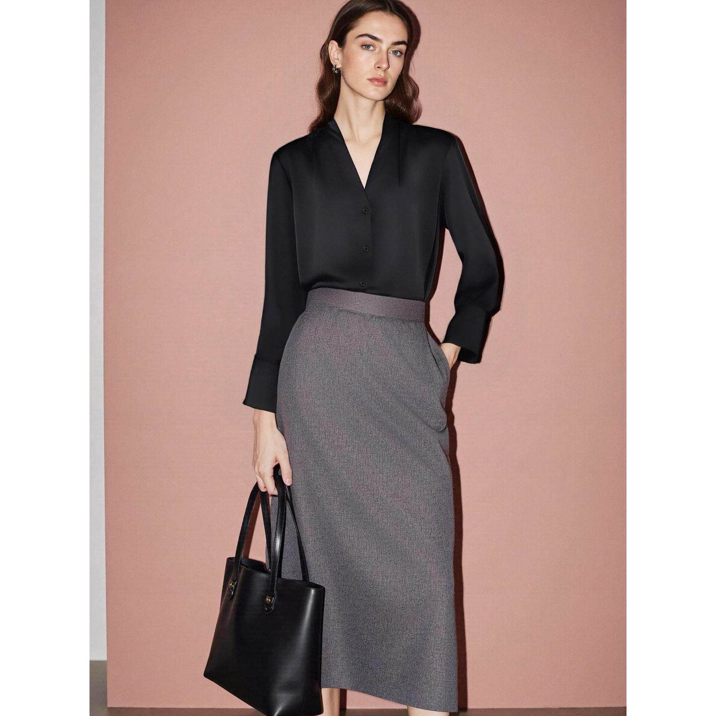 BasicHouse/百家好2026春季新款高智黑色缎面衬衫,以法式优雅为灵感,采用柔滑垂坠的缎面材质,光泽细腻,彰显高级质感。简约利落的剪裁搭配微宽松版型,轻松打造随性叠穿造型,无论是搭配西装、针织背心或单穿,皆能展现知性气质。前襟隐藏扣设计,细节精致,袖口微喇处理增添复古韵味。黑色经典百搭,适配多种场合,通勤、约会皆宜。这款衬衫融合现代极简与法式浪漫,是春季衣橱不可或缺的时尚单品,诠释低调奢华的女性魅力。