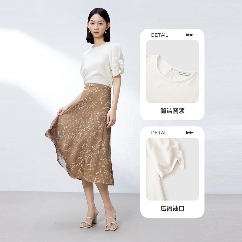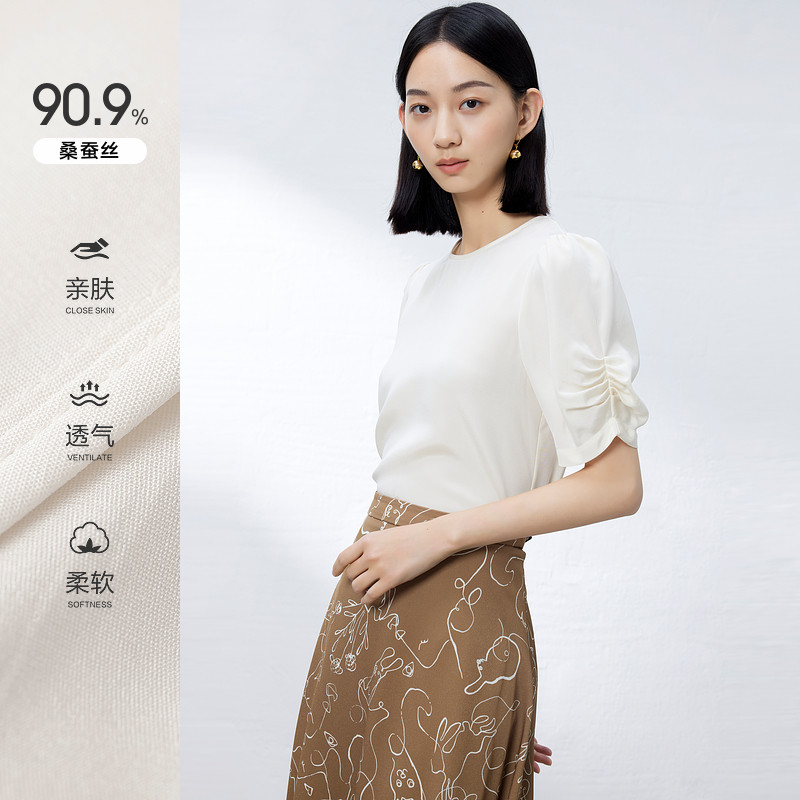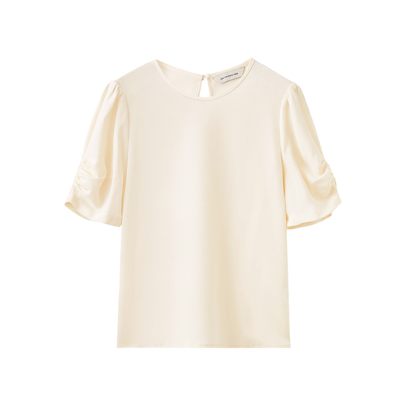 天猫水云间灯笼袖衬衫女式真丝缎面短袖上衣桑蚕丝衬衣圆领2026夏新款