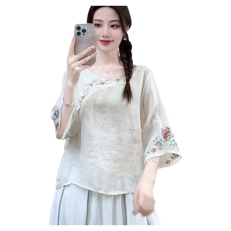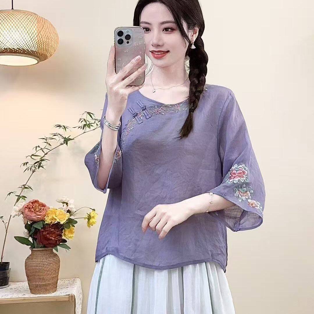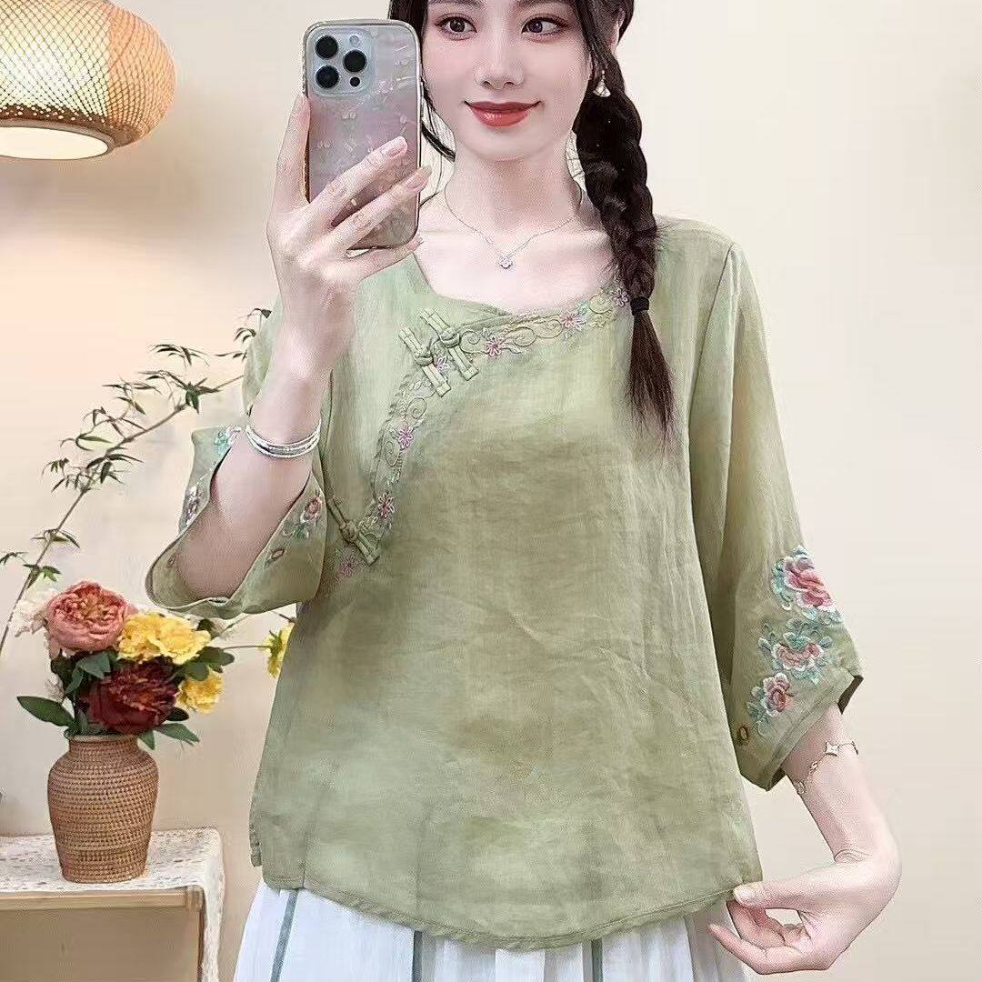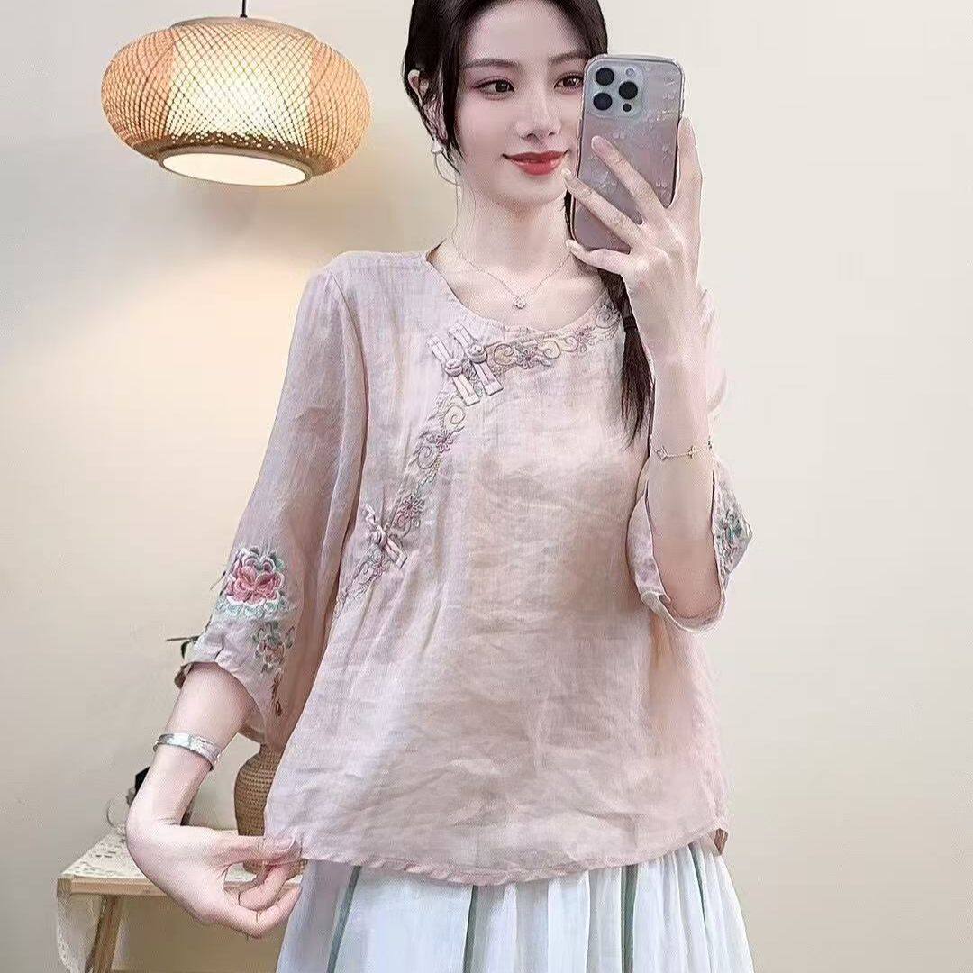 淘宝中国风棉麻绣花衬衫女春夏新款七分袖宽松文艺复古民族风茶服上衣