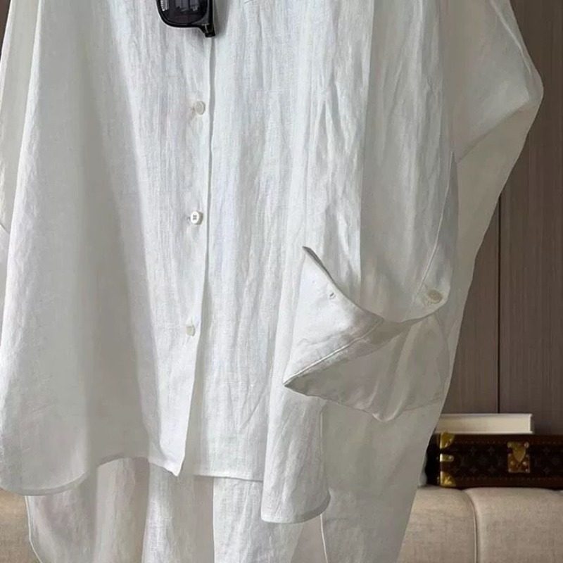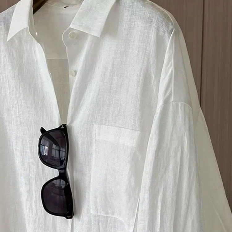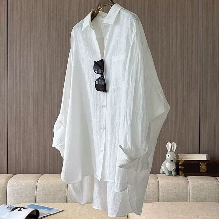 淘宝高级感白色亚麻长袖衬衫女春夏宽松慵懒松弛前短后长防晒开衫上衣