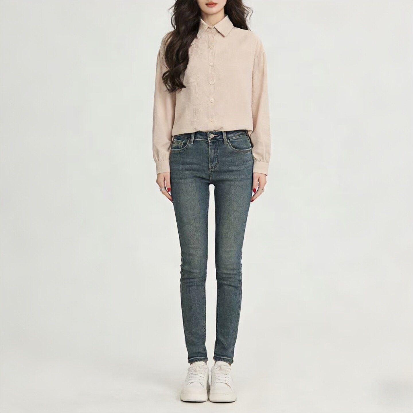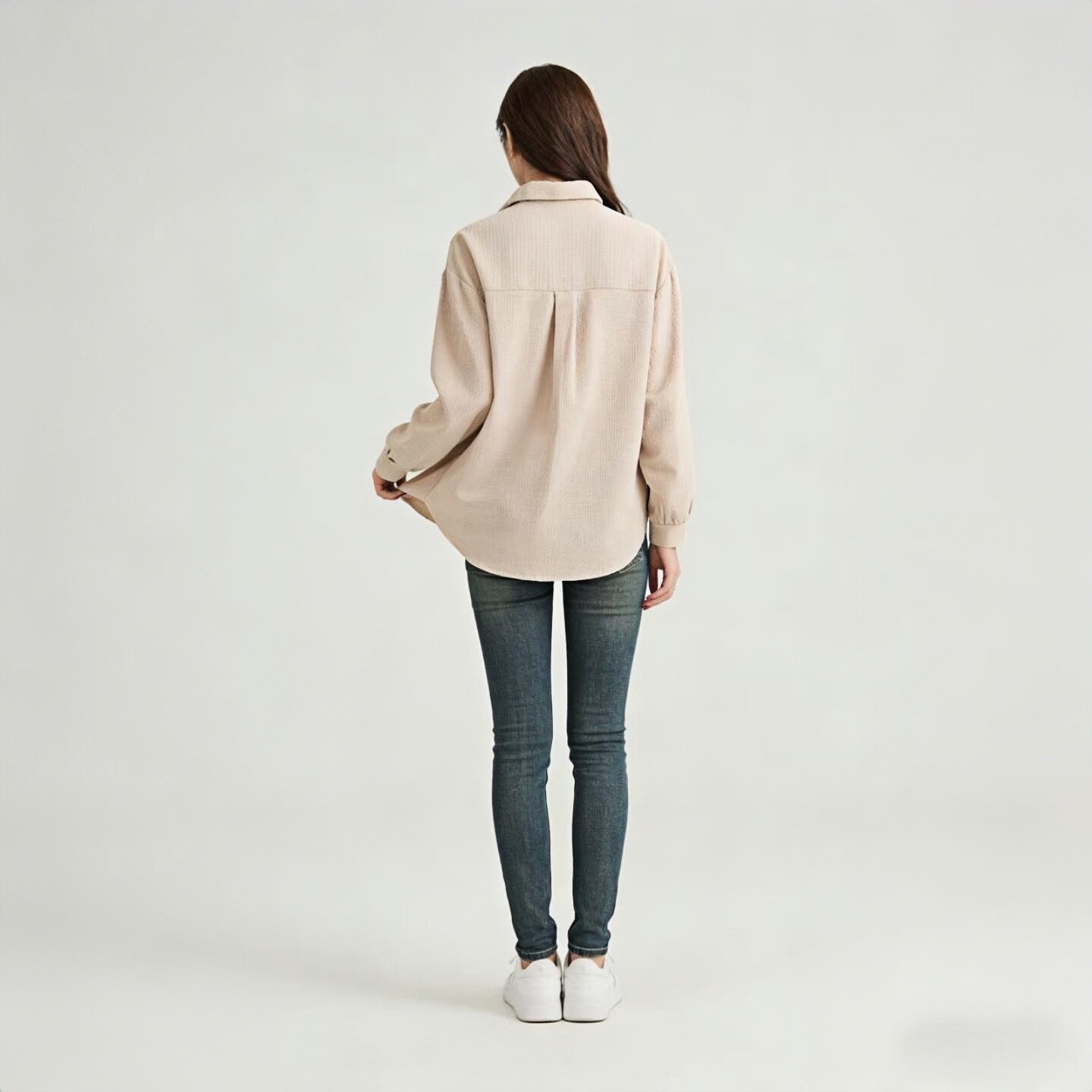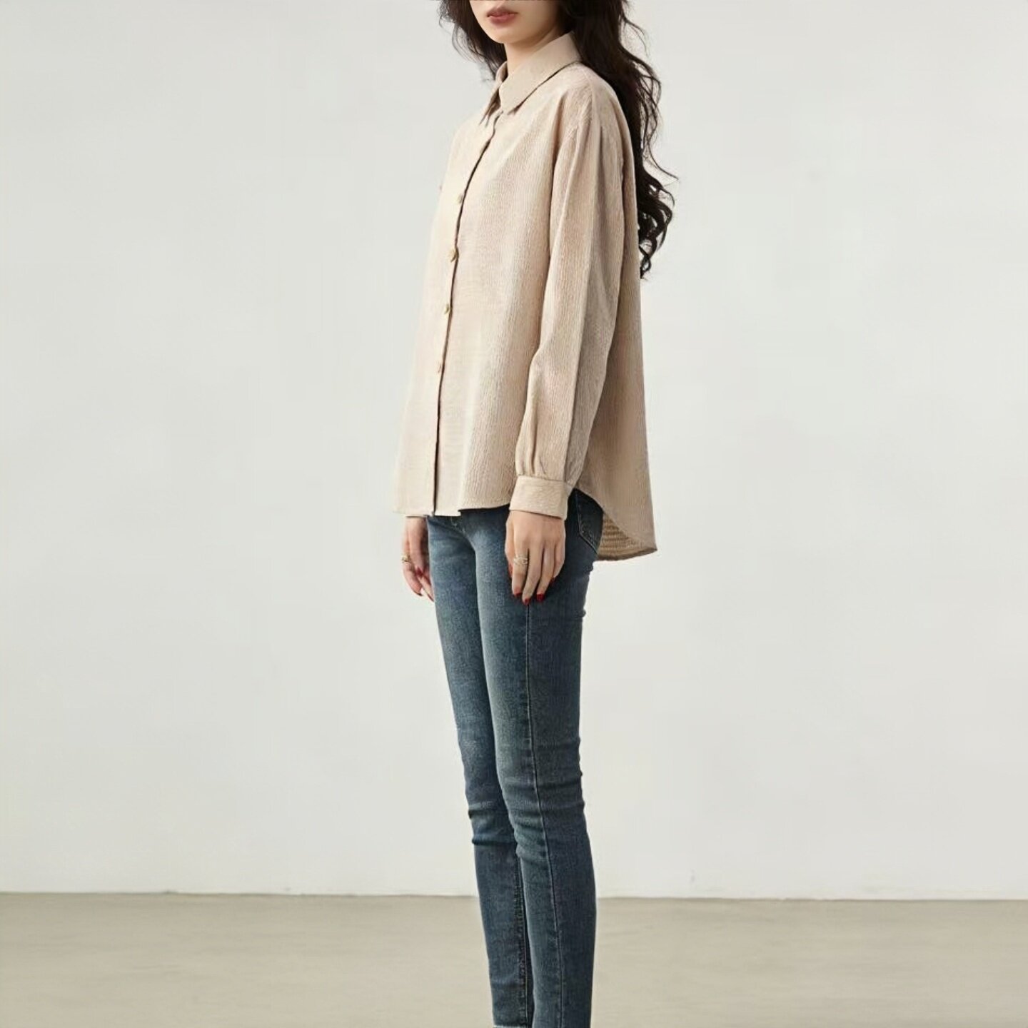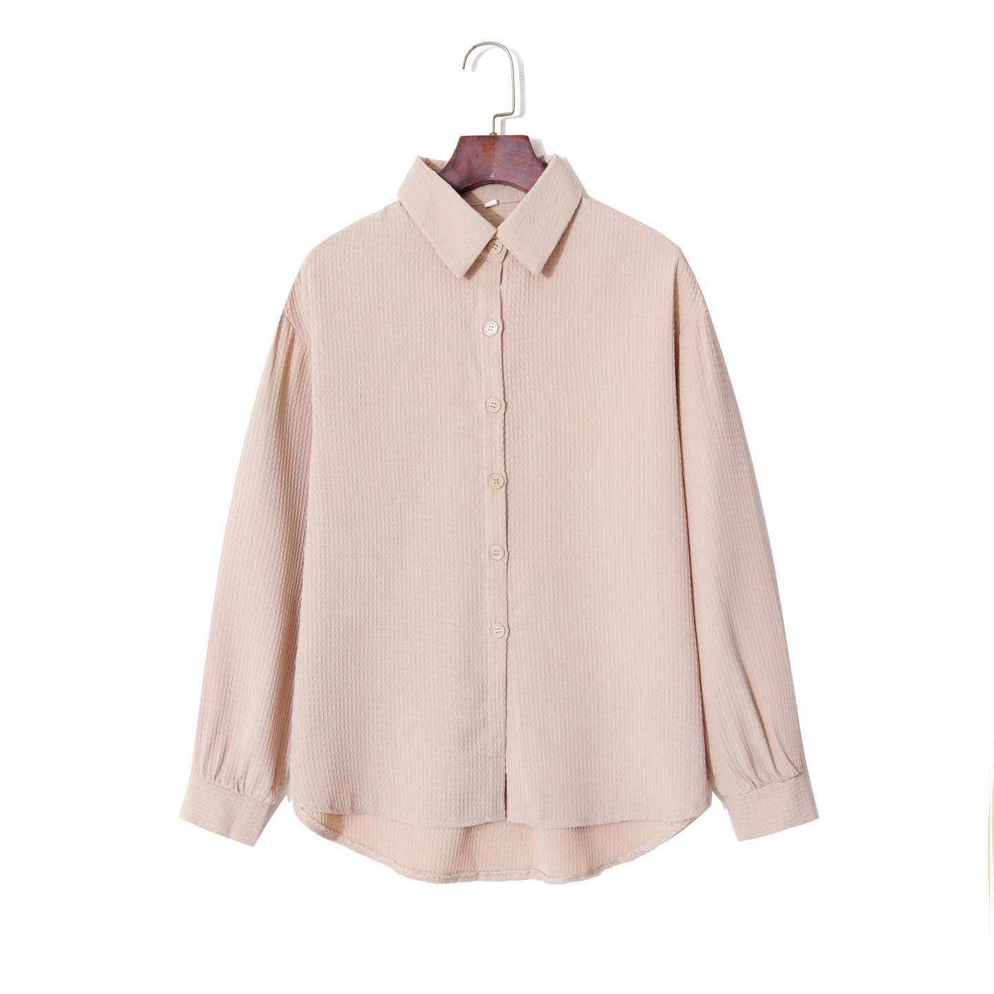 2026春夏季新款浅杏色华夫格衬衫,以温柔低饱和的浅杏色调为基调,融合立体肌理感的华夫格面料,质感轻盈透气,带来自然褶皱的慵懒美学。宽松版型设计,不挑身形,穿着随性自在,长袖剪裁兼顾防晒与造型感。无论是搭配短裤、阔腿裤或半裙,都能轻松打造简约舒适的休闲风格。细节处注重工艺,领口、袖口与下摆线条利落,彰显低调质感。这款衬衫兼具实用性与时尚感,是春夏衣橱中不可或缺的百搭单品,完美诠释现代女性追求舒适与美感并存的生活方式。
