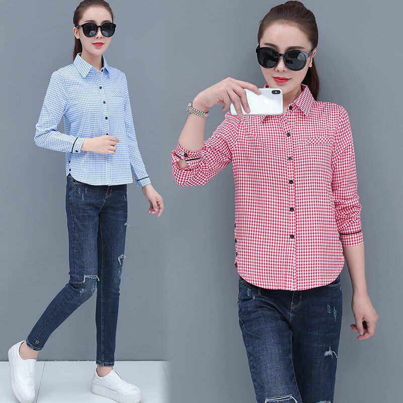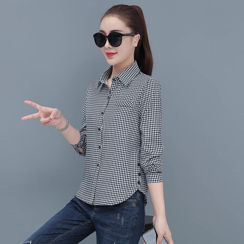 淘宝2024春秋新款格子条纹修身长袖衬衫女打底衫休闲百搭女士衬衣上衣