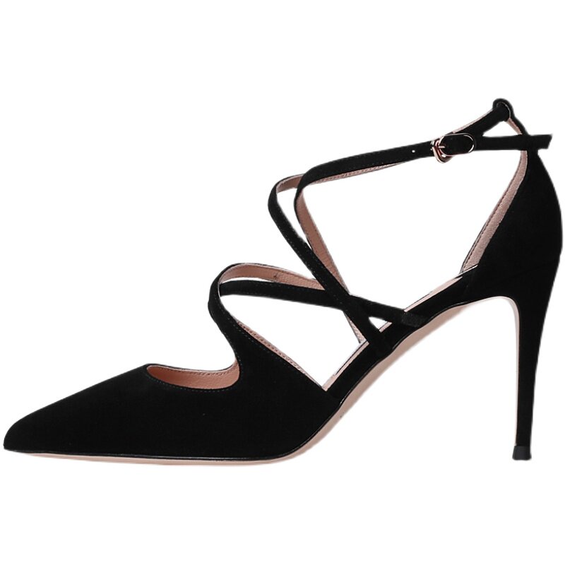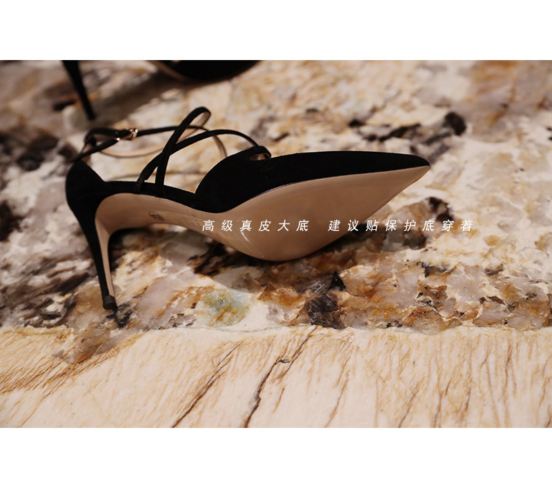 淘宝镇店之宝 高级定制黑色麂皮 8.5CM高跟性感凉鞋 尖头罗马绑带女鞋