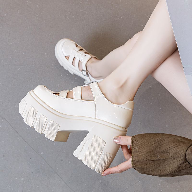 淘宝11cm小个子内增高罗马凉鞋女2025夏季真皮包头粗跟厚底镂空猪笼鞋