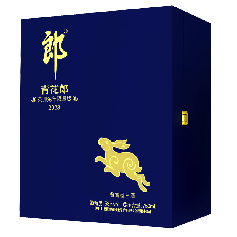 [限量收藏]郎酒青花郎2023癸卯兔年生肖纪念酒,53度酱香型白酒,精选赤水河流域优质高粱,传承千年古法酿造工艺,经长期窖藏精心勾调而成。酒体醇厚丰满,酱香突出,回味悠长,空杯留香持久。瓶身融合中国传统生肖文化与现代设计美学,以灵动玉兔为主题,寓意祥瑞安康,兼具艺术价值与收藏意义。全球限量发售,每瓶均配有专属编号及收藏证书,是品鉴、礼赠、典藏的绝佳之选。青花郎生肖酒系列延续品牌高端定位,见证岁月流转,承载美好祝愿,值得藏家珍视。
