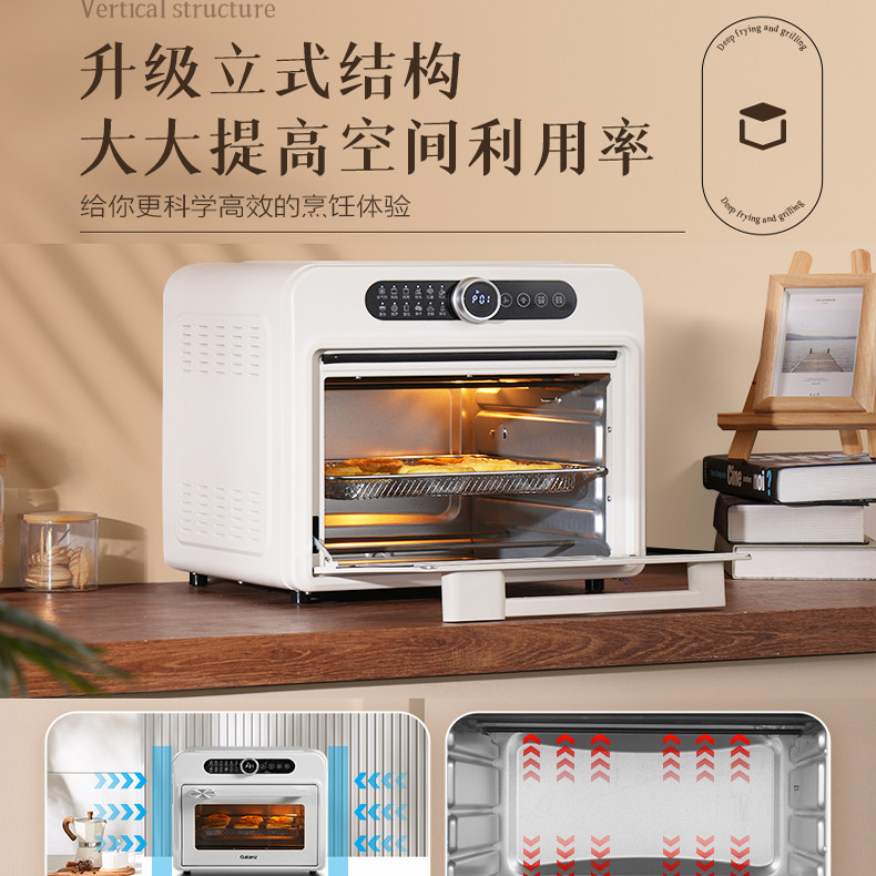 格兰仕2026新款家用智能空气炸电烤箱,集烘焙、空气炸、烘烤等多功能于一体,专为现代家庭厨房设计。采用立式大容量结构,空间利用率高,轻松容纳整鸡或多层烤盘,满足全家需求。配备智能触控面板与多档温控系统,精准控温,操作简单便捷。内置热风循环技术,实现无油空气炸,健康低脂;同时支持上下独立加热,烘焙更均匀。小巧机身节省台面空间,却拥有强大性能。不锈钢外壳美观耐用,易清洁。无论是烤鸡翅、蛋糕还是披萨,都能轻松搞定,是追求健康美味与高效烹饪的理想之选。