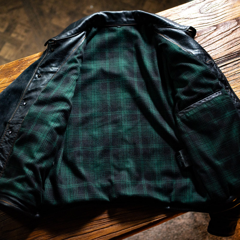 LEZORA vintage A2!手工擦色做旧山羊皮拉绒格子布飞行夹克皮衣男