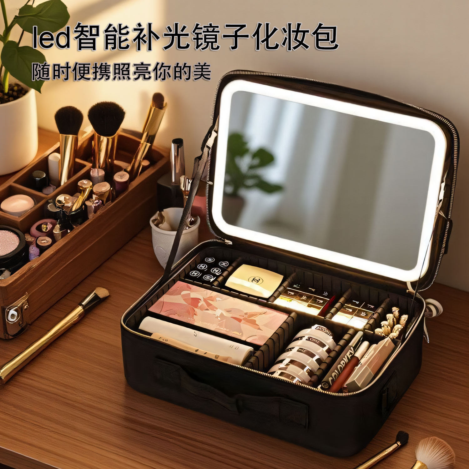 这款高级LED带镜子旅行化妆包,专为现代女性设计,集实用与美观于一体。采用优质防水面料,轻便耐用,大容量分层设计,轻松收纳各类化妆品与化妆刷,分区明确,取用便捷。包内配备高亮LED环形灯,光线柔和均匀,模拟自然光,确保上妆更精准。内置可充电电池,续航持久,USB充电接口方便随时补电。手提与肩背两用设计,出行更灵活。无论是日常通勤还是长途旅行,都能满足精致妆容需求,是爱美女性不可或缺的随身美妆伴侣。