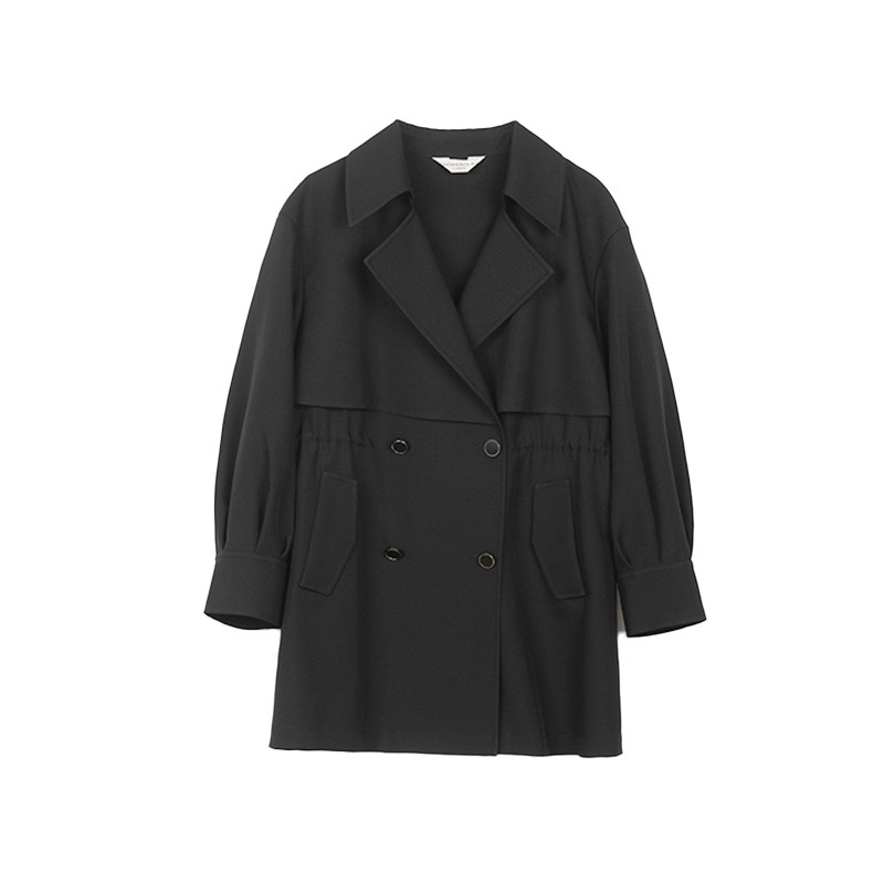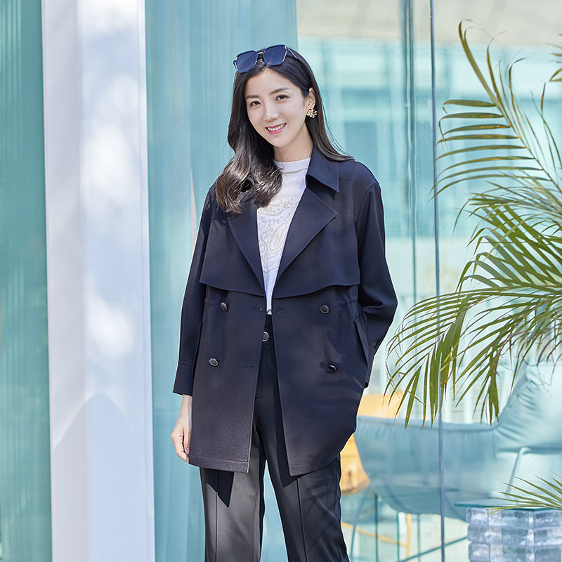 淘宝诗梦女装黑色轻薄风衣春季新款双排扣休闲通勤中长翻领抽绳外套