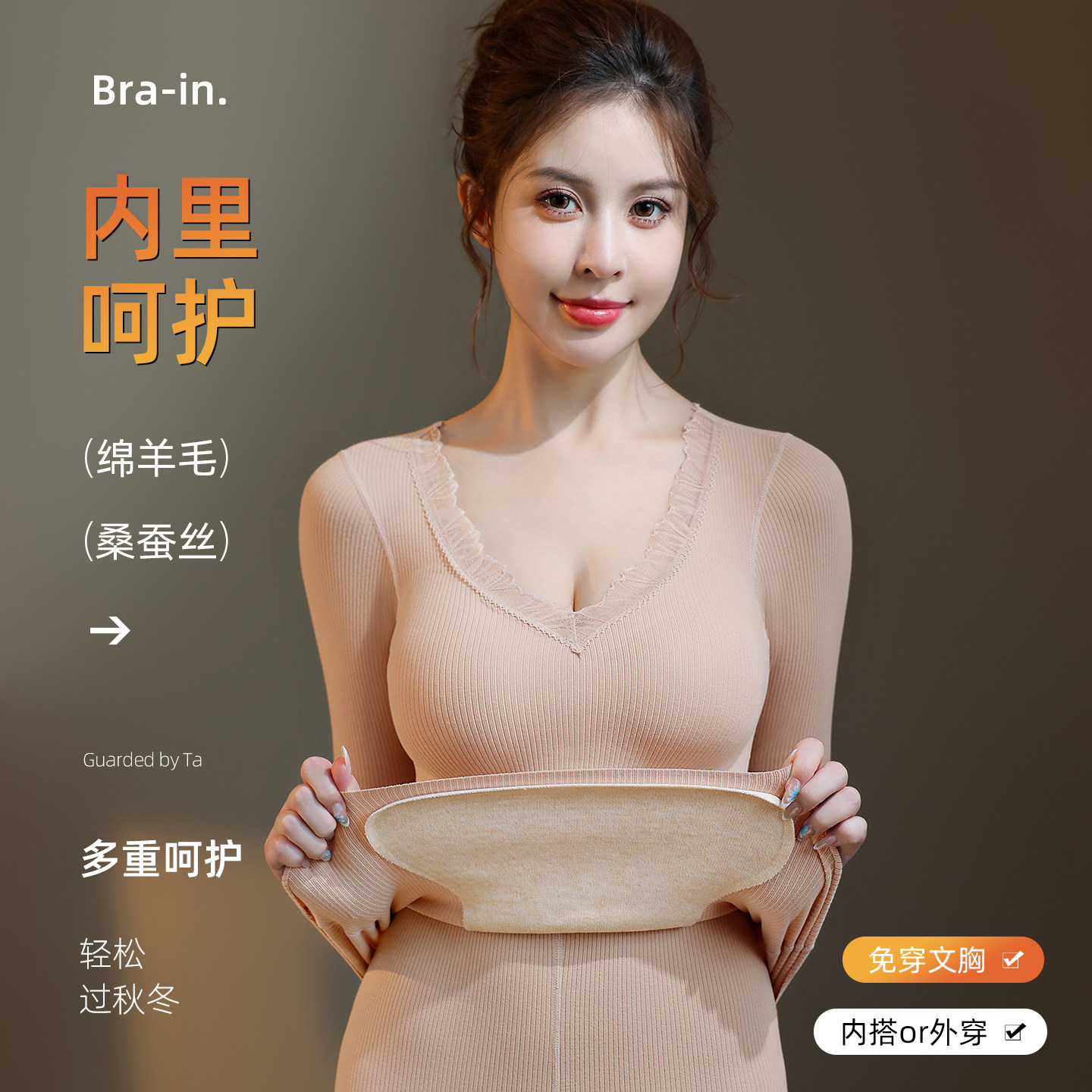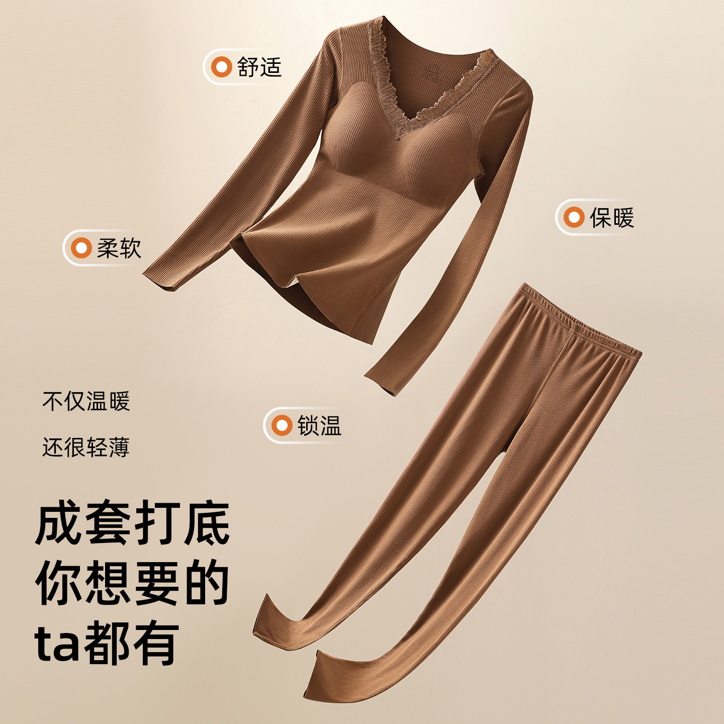 天猫保暖内衣女士加绒冬季贴身绵羊毛发热打底带胸垫秋衣秋裤套装女款
