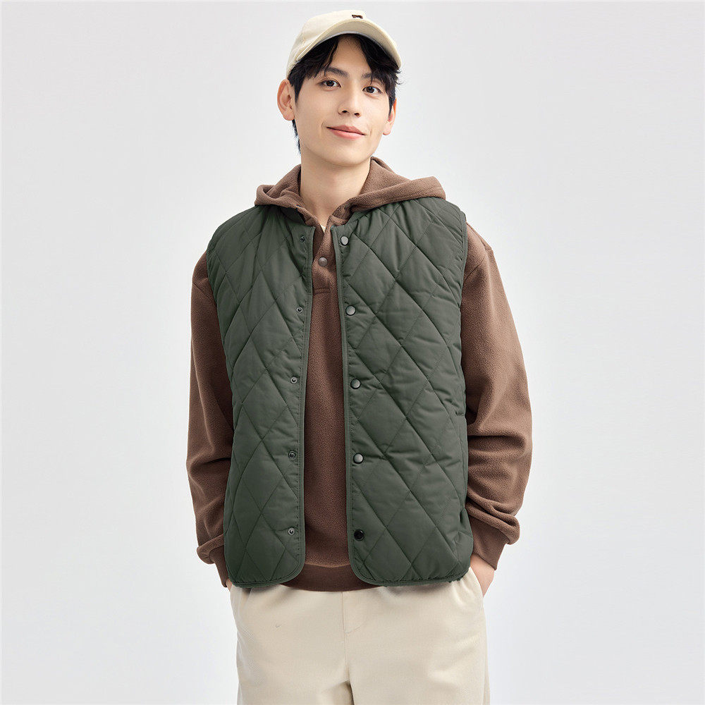 佐丹奴2023秋冬新款男装背心外套(货号:13075824),采用经典菱形格纹设计,搭配细腻夹棉内里,兼具保暖性与时尚感。立领剪裁利落有型,凸显男性干练气质,纯色设计简约百搭,轻松融入日常通勤或休闲穿搭。外层选用优质防风面料,轻盈挺括,内层加棉工艺提升锁温效果,适合秋冬季节穿着。前襟拉链开合顺畅,侧边插袋实用便捷,兼顾美观与功能性。无论是搭配毛衣、衬衫还是卫衣,都能轻松打造层次分明的都市型格,是男士秋冬衣橱的实用之选。