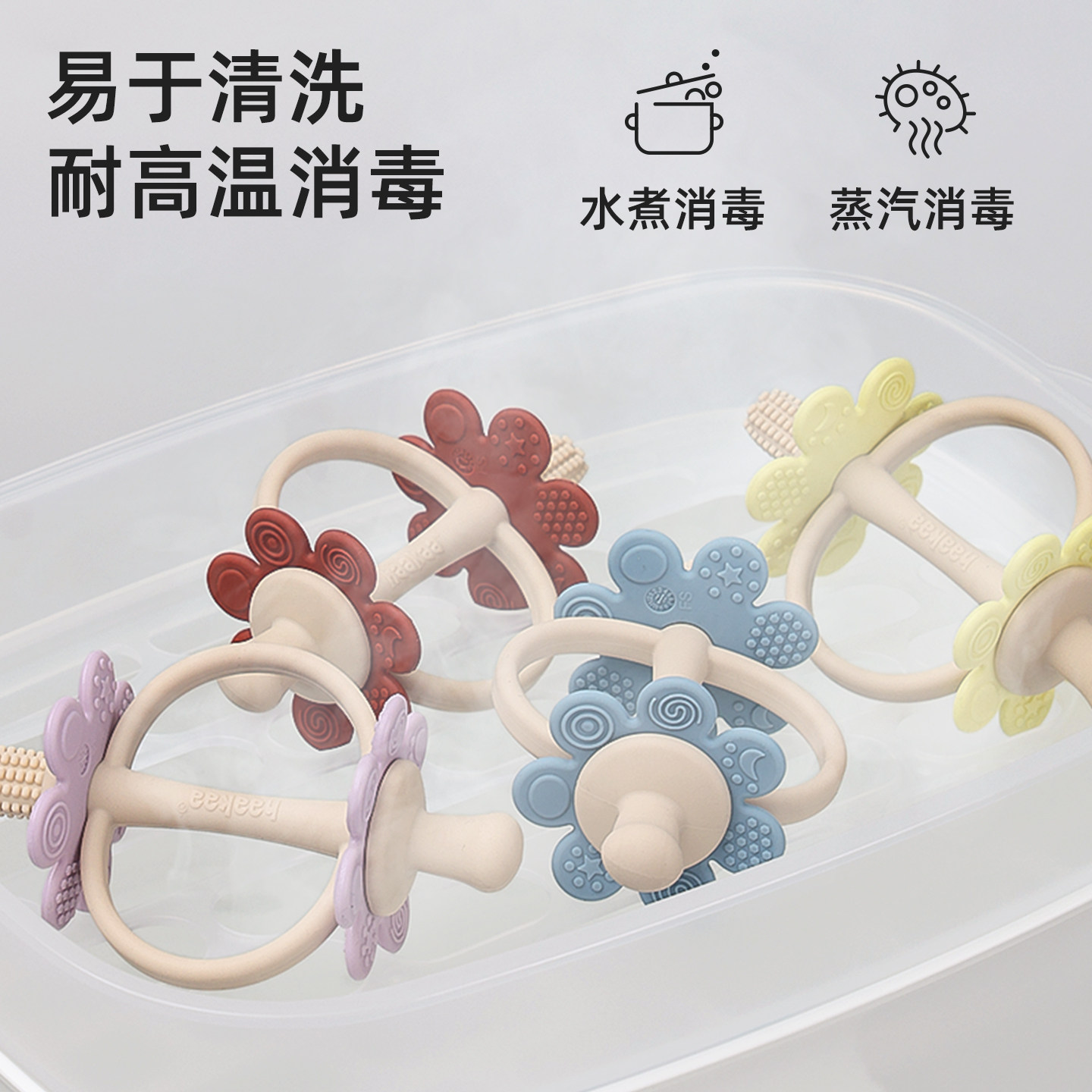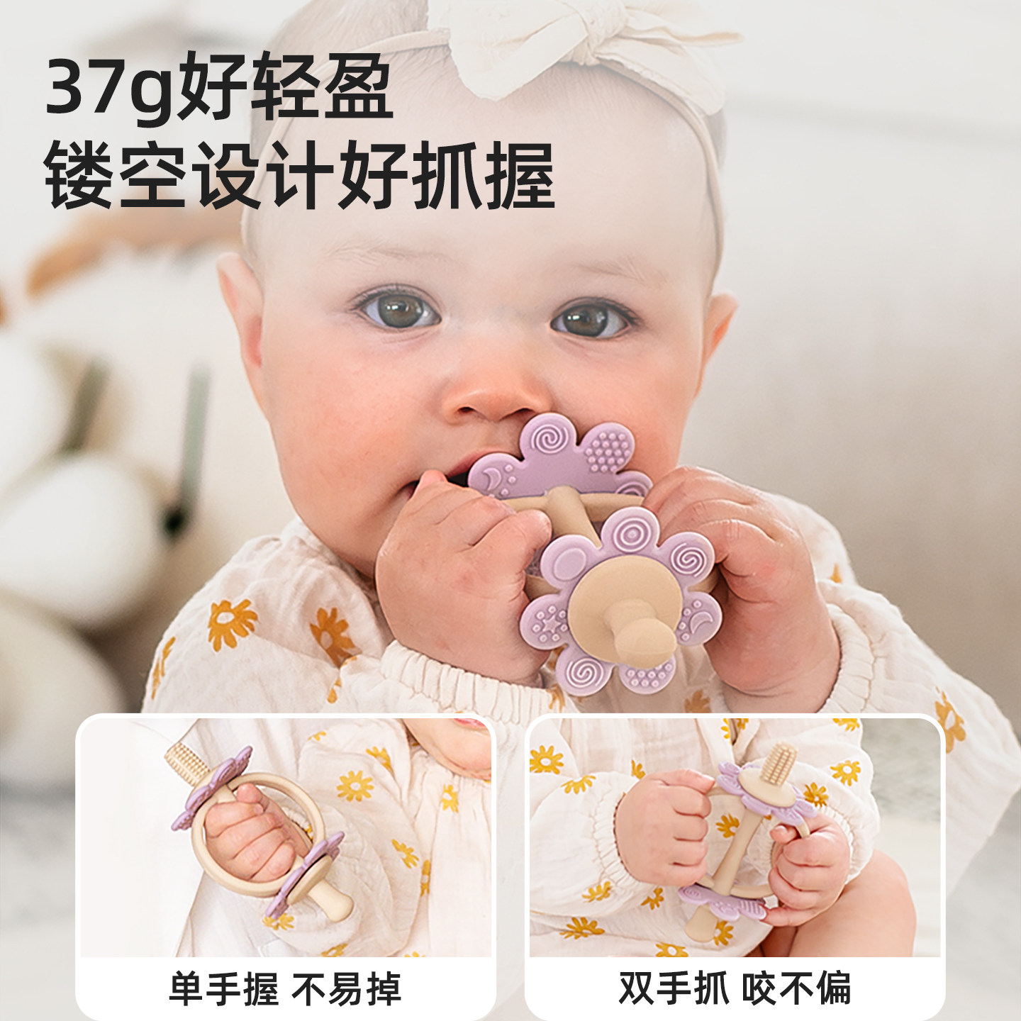 haakaa花朵牙胶磨牙棒专为3-6个月以上小月龄宝宝设计,采用食品级液态硅胶材质,安全无毒、柔软耐咬,有效缓解宝宝出牙期牙龈不适。独特花朵造型贴合宝宝小手,便于抓握,帮助锻炼手部精细动作和手眼协调能力。圆润边缘光滑无毛刺,保护宝宝娇嫩口腔。同时,其可爱的外观设计能吸引宝宝注意力,减少吃手习惯。可冷藏后使用,清凉感进一步舒缓牙龈肿痛。易清洗、耐高温,支持蒸汽或水煮消毒,使用更安心。haakaa花朵牙胶不仅是实用磨牙工具,更是陪伴宝宝健康成长的贴心伙伴。