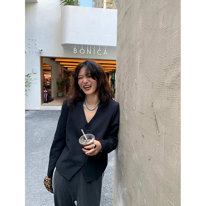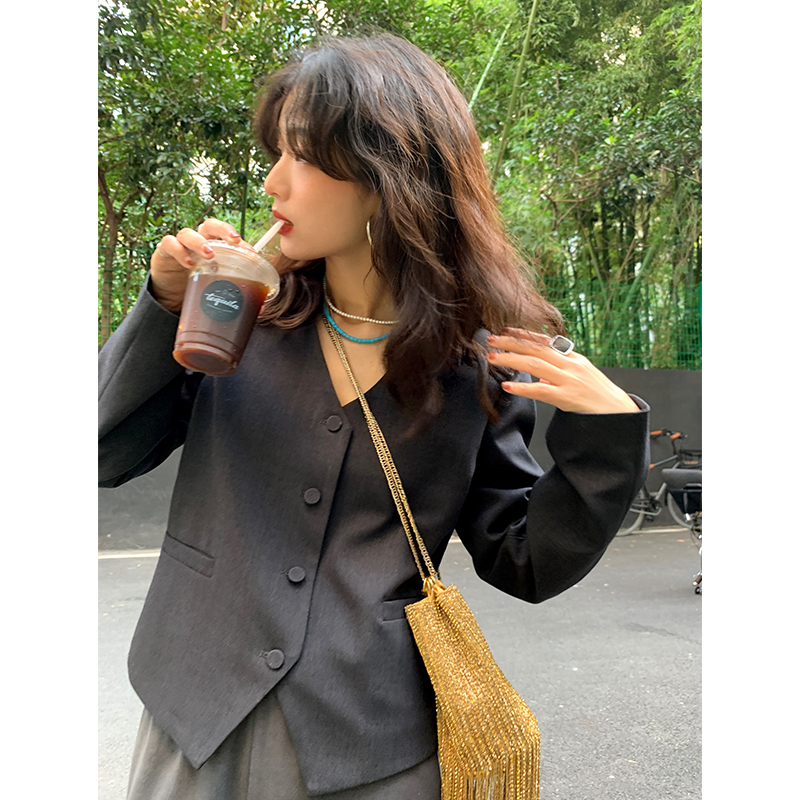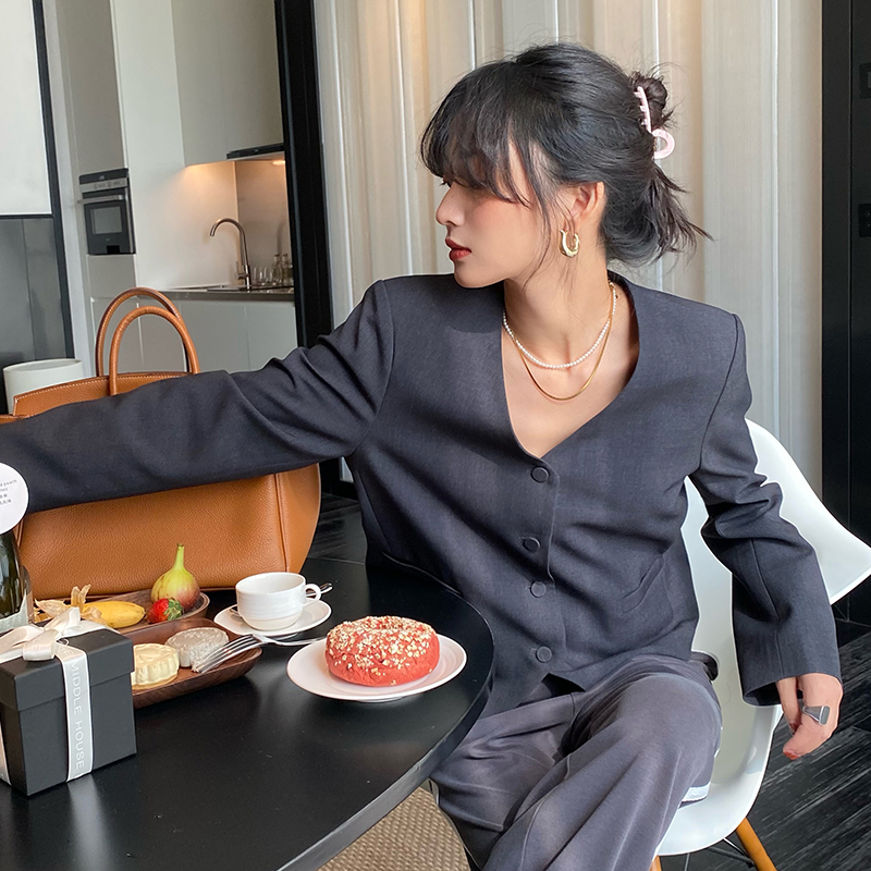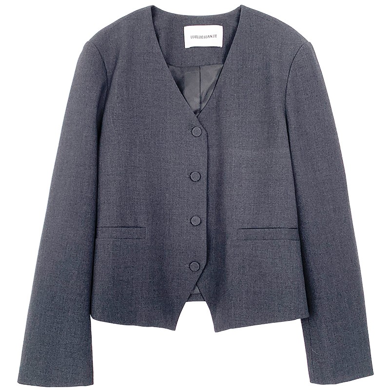 淘宝落落狷介 灰色V领秋款西装外套女2025年新款西服小个子设计感小众