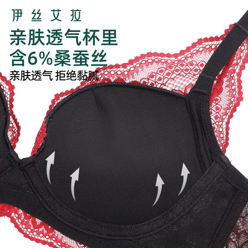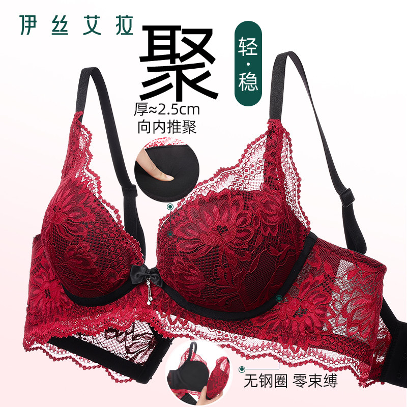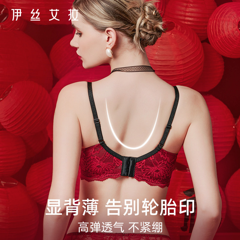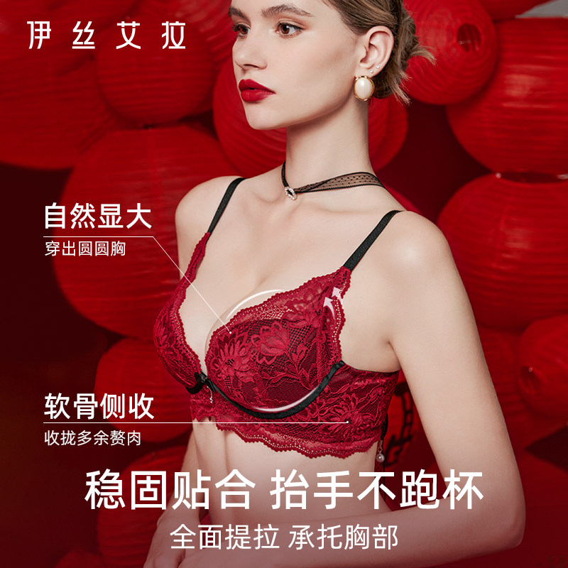 伊丝艾拉红色蕾丝内衣女士小胸聚拢显大结婚新娘性感纯欲文胸套装