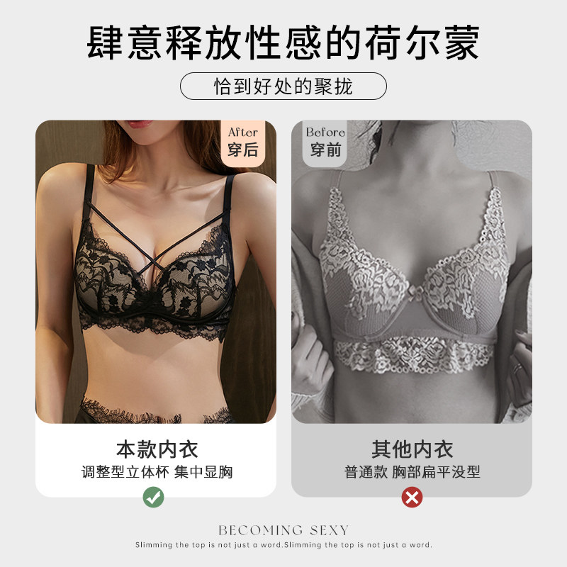 淘性感刺绣蕾丝性感超薄款文胸套装低心位U型内衣透视大胸显小聚拢