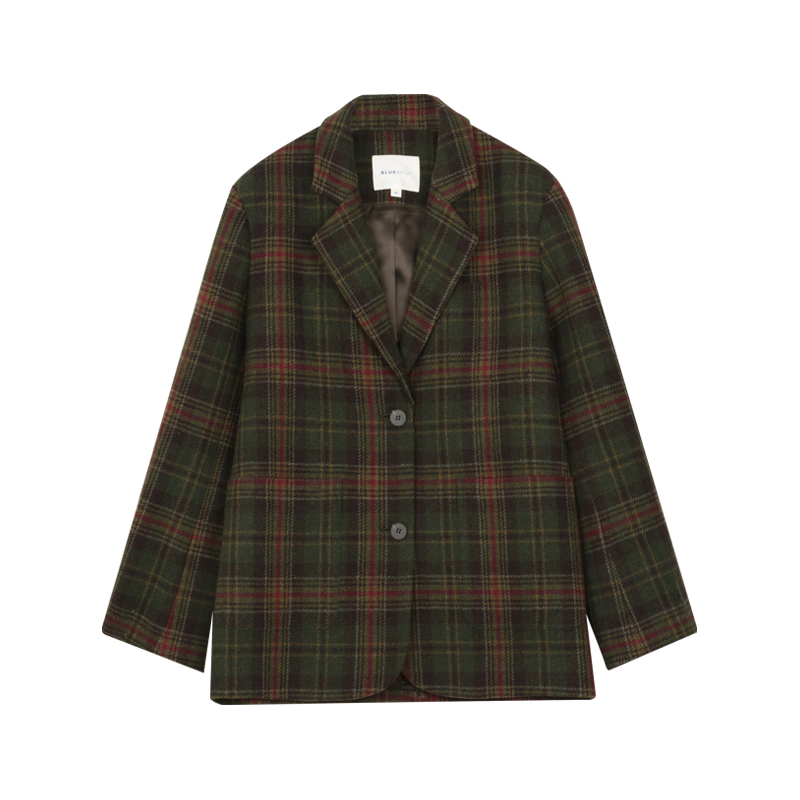 淘宝BLUEerror 宽松羊毛格子毛呢西装外套女百搭格纹棕色呢子外套秋冬