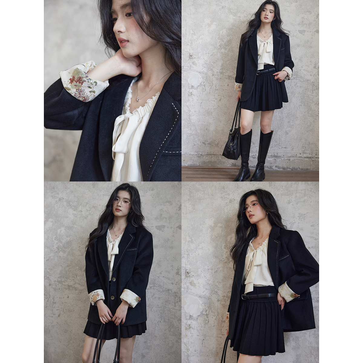 淘宝贰羊设计【秋漓】新中式撞色黑色西装外套女秋休闲翻驳领设计西服