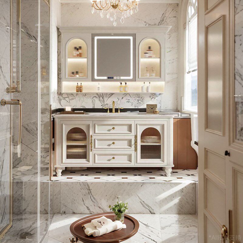 欧式实木浴室柜组合是一款兼具美观与实用的卫浴家具,精选优质实木材质,经防潮防腐处理,坚固耐用,适应潮湿环境。采用经典欧式设计,线条优雅,雕花精致,彰显典雅气质,为浴室增添艺术美感。落地式结构稳固承重,搭配台下盆或一体盆设计,清洁便捷。柜体分层储物空间丰富,可收纳洗漱用品、毛巾等,保持台面整洁。整体风格百搭,适用于现代、轻奢或复古装修风格,是提升浴室品质的理想选择。安装简便,环保健康,为您打造舒适优雅的洗漱空间。