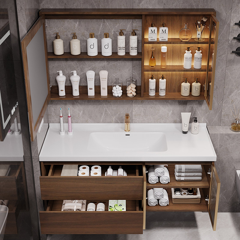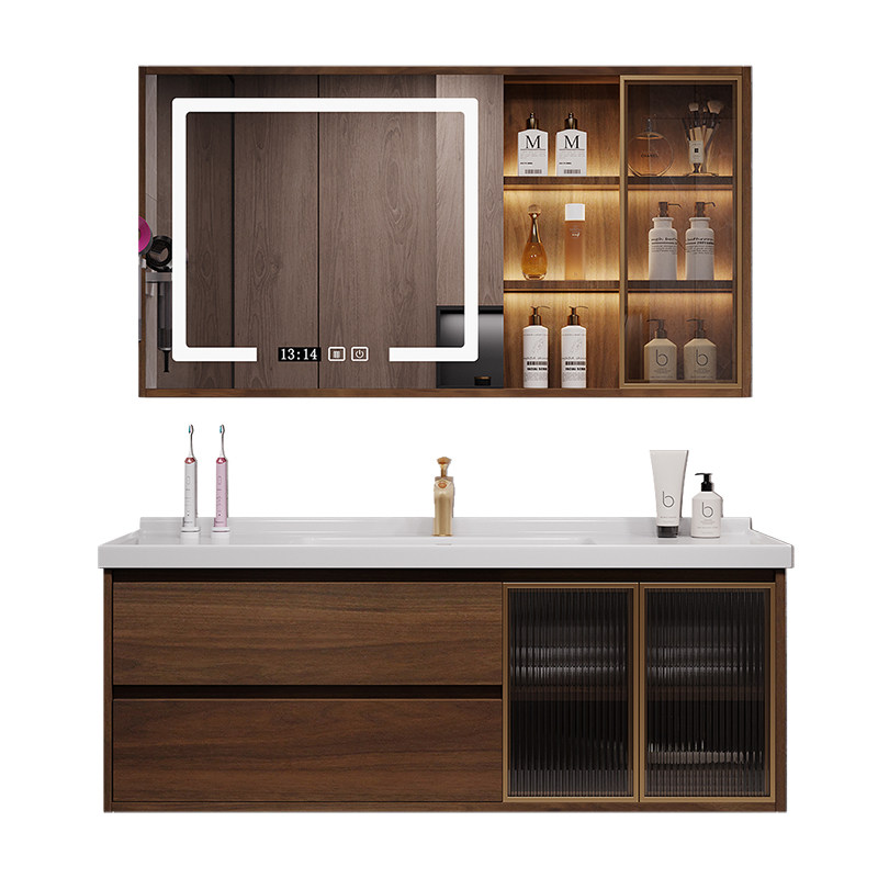 新款中古风胡桃木陶瓷一体盆浴室柜组合,融合经典与现代美学,精选优质胡桃木打造柜体,纹理细腻、质感温润,尽显低调奢华。搭配高温烧制陶瓷一体盆,表面光滑易清洁,边缘圆润设计安全贴心。整体造型简约大气,线条流畅,完美契合新中式、侘寂风等家居风格。柜体储物空间合理分区,满足洗漱用品收纳需求,防潮防霉工艺确保长久耐用。安装便捷,适配多种户型卫生间,不仅提升空间格调,更带来舒适实用的使用体验,是现代家居的理想之选。