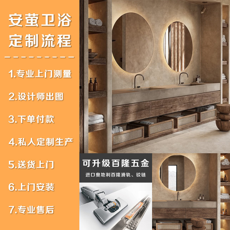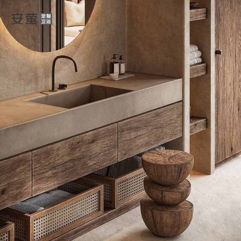 天猫中古风浴室柜组合岩板一体盆洗漱台卫生间定制复古实木洗手脸面池