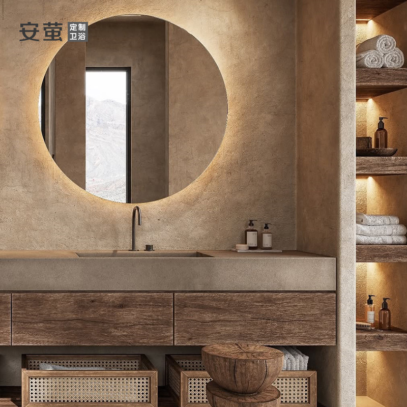 中古风浴室柜组合圆角卫生间洗漱台梅花镜洗手盆奢石洗脸盆柜定制
