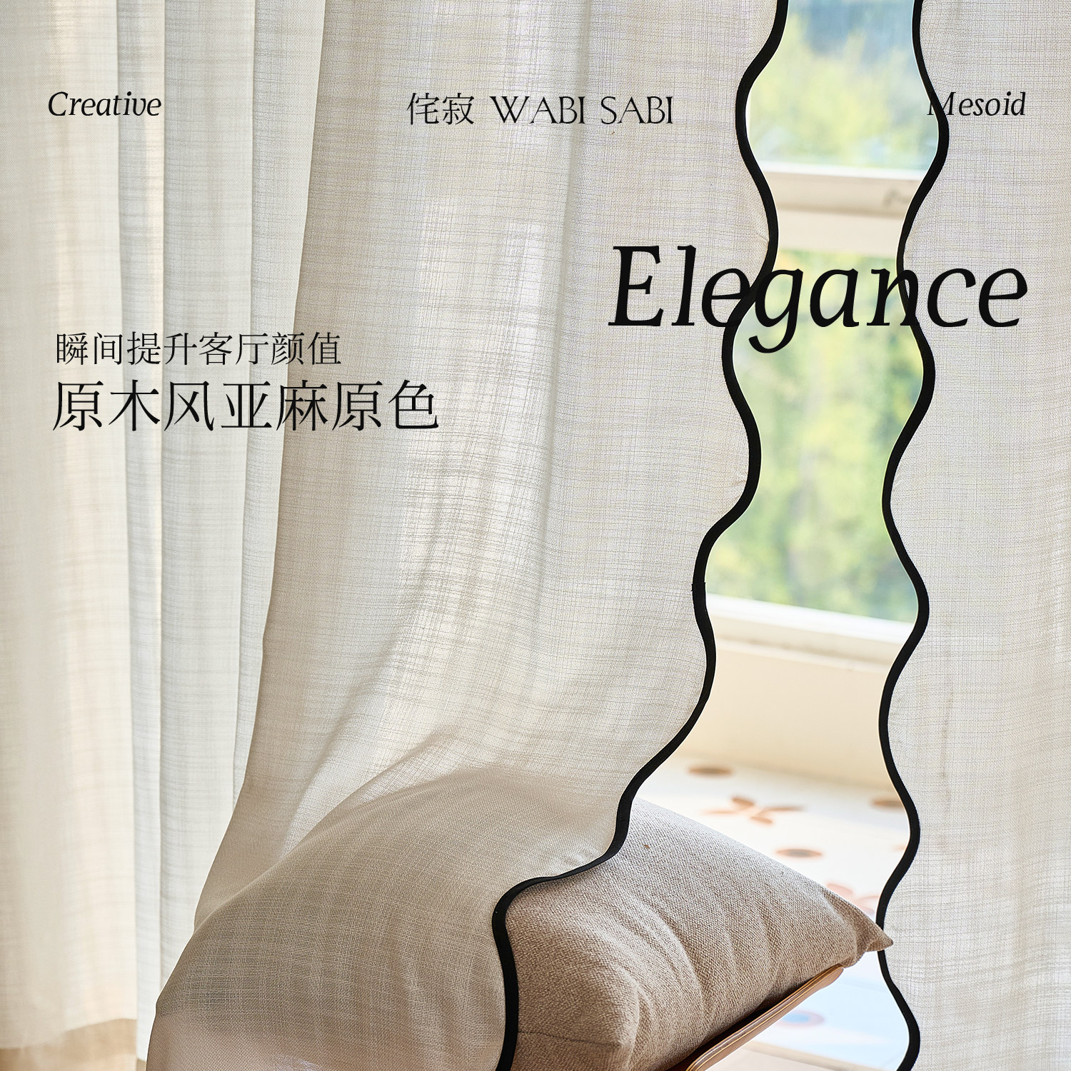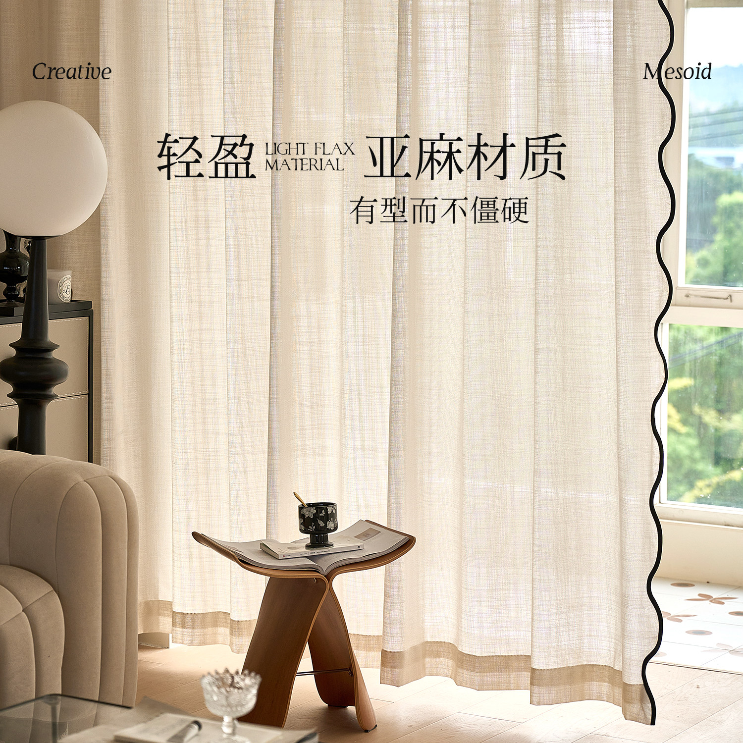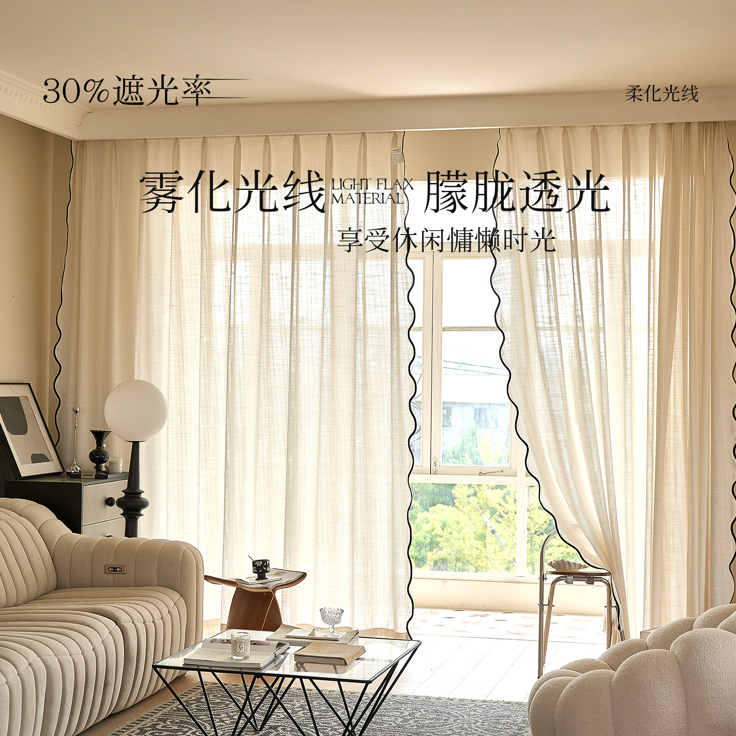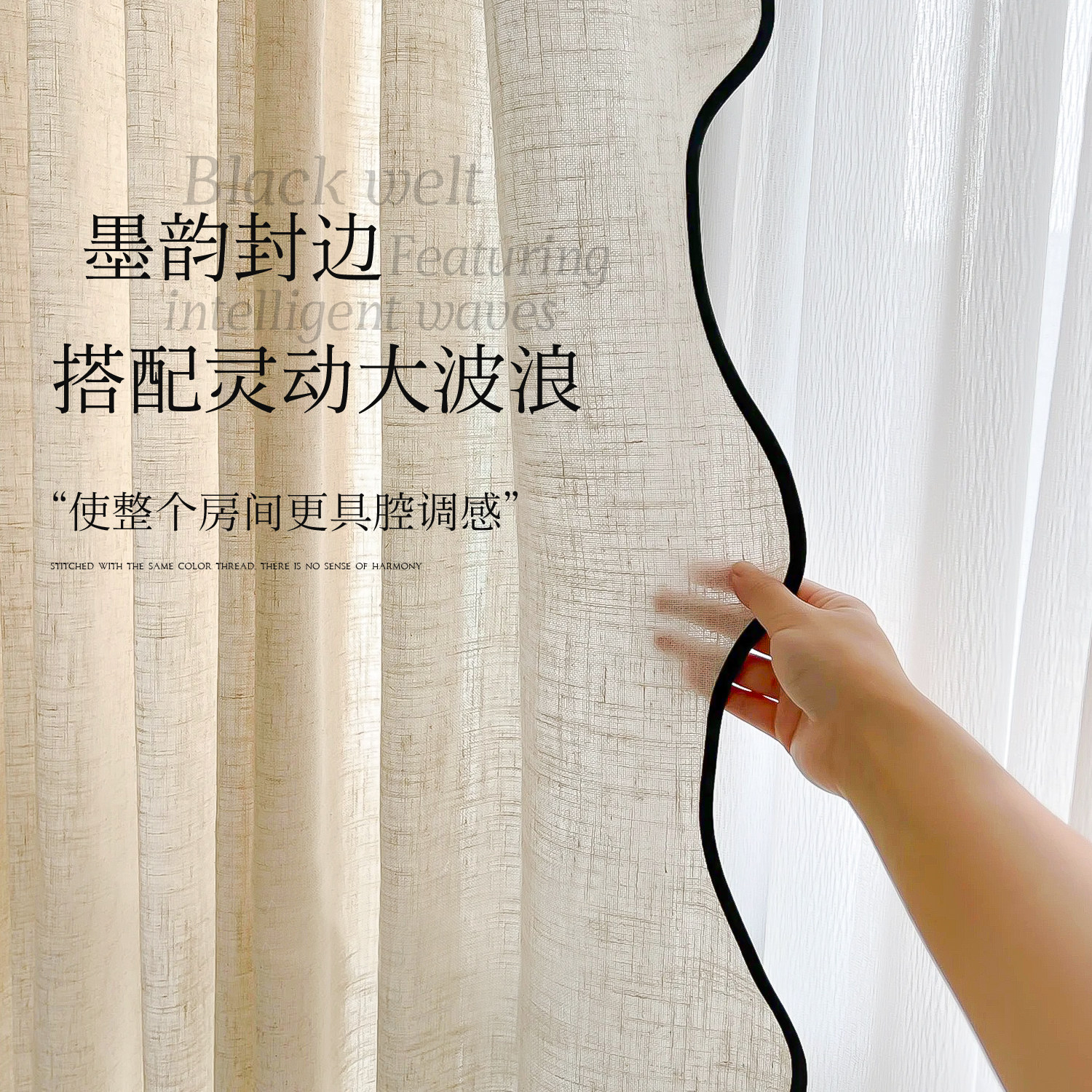 【重工系列】法式中古风墨韵边波浪亚麻纱帘,融合侘寂美学与轻奢质感,以天然亚麻为基底,手工打造波浪褶皱,呈现自然垂坠的灵动感。墨韵边饰如水墨晕染,勾勒出东方诗意与法式优雅的碰撞,复古中透出现代极简的静谧气质。透光不透影的细腻纱质,柔化光线,营造朦胧静谧的居家氛围。无论是客厅、卧室或茶室,皆能彰显独特艺术格调。每一幅窗帘皆经匠心织造,细节考究,是追求品质生活与美学表达的优选之作,让空间在时光流转中沉淀出温润而高级的韵味。