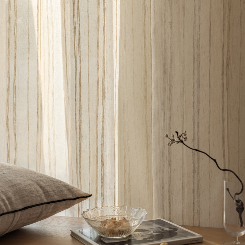 淘宝新款中古亚麻条纹纱帘客厅卧室民宿日式原木风透光不透人窗纱