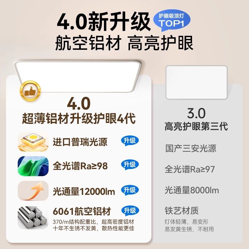 箭牌超薄全光谱护眼客厅吸顶灯2026新款,融合现代简约设计与先进光学科技,打造健康舒适照明体验。采用全光谱LED光源,高度还原自然光,有效缓解视觉疲劳,呵护全家视力健康。灯体厚度仅26mm,极简超薄设计,适配多种层高户型,彰显大气格调。支持智能调光调色,满足不同场景需求。搭配全屋套餐,风格统一,安装便捷,适用于客厅、卧室、书房等空间。高显色指数(Ra≥95)、无频闪、低蓝光,兼顾美观与实用,是现代家居的理想照明之选。箭牌品质保障,点亮智慧生活。