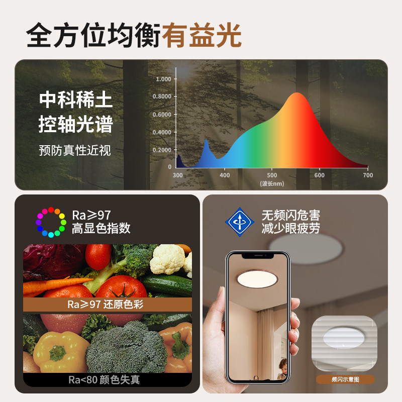 【国补】至御中古卧室吸顶灯,采用胡桃木色雅致外观,融合天御超薄设计,简约大气,适配多种家居风格。搭载全光谱中科护眼光源,模拟自然光,显色指数高,有效减少蓝光危害,呵护双眼健康,尤其适合长时间阅读或休息的卧室环境。光线柔和均匀,无频闪、无眩光,营造舒适静谧的居家氛围。通过国家节能补贴认证,品质可靠,节能高效。安装便捷,适配标准吸顶底座,是追求健康照明与生活美学的理想之选,让每一次开灯都成为对眼睛的温柔守护。