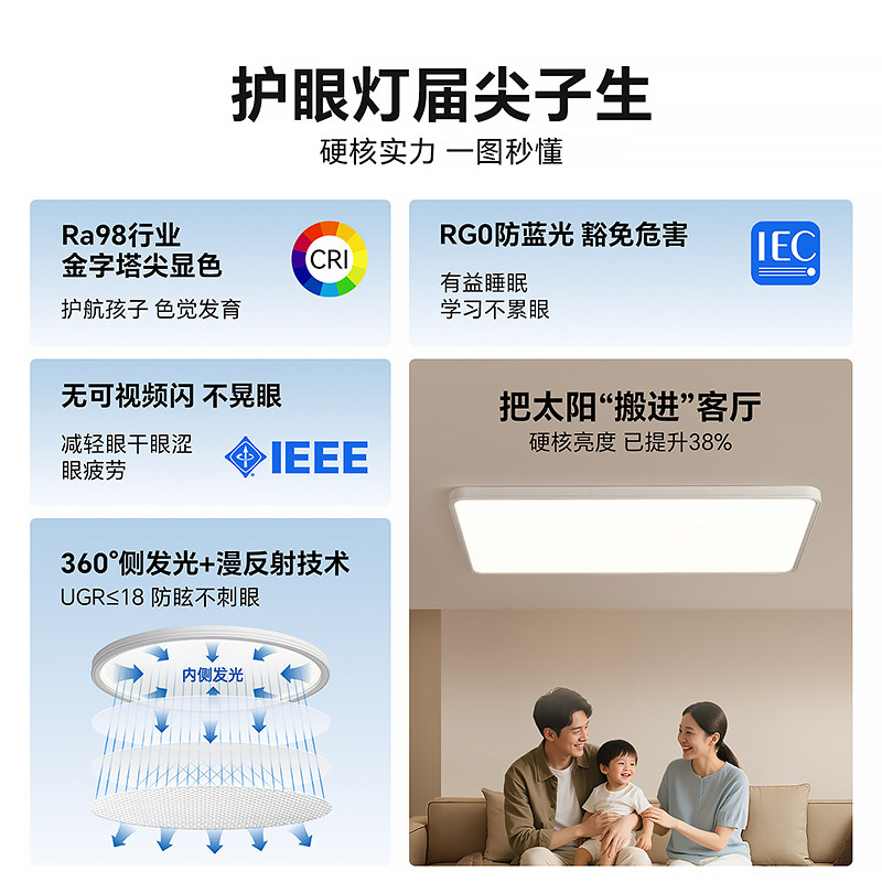 箭牌眼卫士稀土控轴防控近视护眼吸顶灯,专为现代家庭客厅设计,融合现代简约美学与科学护眼科技。采用稀土控轴光学技术,有效过滤有害蓝光,光线柔和均匀,无频闪、无眩光,显著降低用眼疲劳,助力儿童青少年近视防控。高显色指数还原真实色彩,营造舒适明亮的居家环境。一体化无缝隙设计,防尘易清洁,安全耐用。高亮节能LED光源,节能环保,寿命长久。适用于客厅、书房等多种场景,兼顾照明需求与健康护眼,是现代家庭追求品质生活的理想之选。