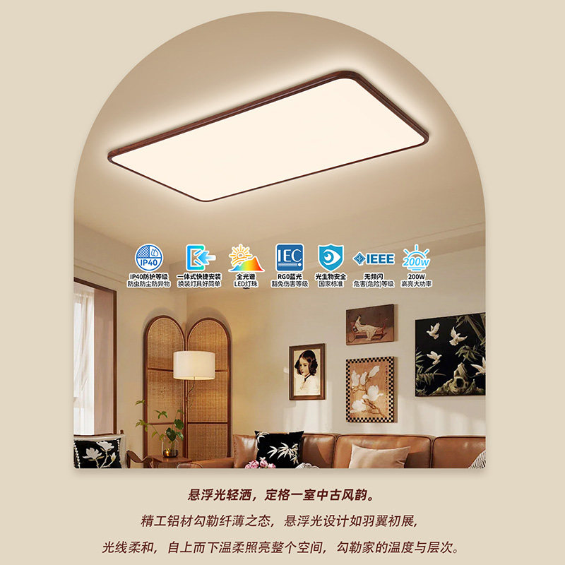 雷士照明中古风吸顶灯融合传统东方美学与现代工艺,采用优质胡桃木纹边框,质感温润,彰显雅致韵味。超薄灯体设计节省空间,适配多种层高,适用于客厅、卧室等全屋场景。搭载全光谱LED光源,光线柔和自然,显色指数高,还原真实色彩,护眼更舒适。高亮照明搭配均匀导光技术,无频闪、无眩光,营造温馨明亮的家居氛围。智能调光调色功能可选,满足不同场景需求。安装便捷,节能环保,是兼顾颜值与实用的理想灯具选择,为现代家居注入古典诗意与生活温度。