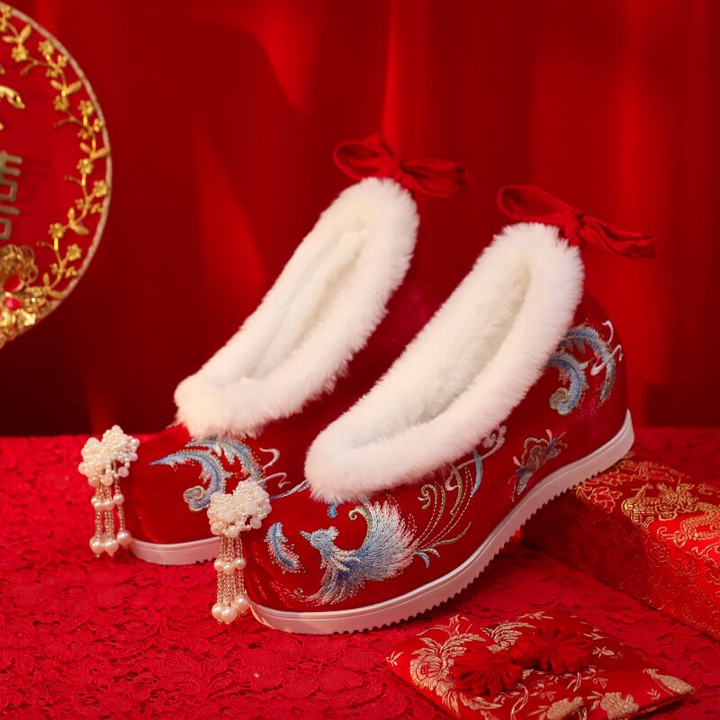 秋冬加绒秀禾服婚鞋中式女古风红色绣花棉鞋汉服鞋新娘结婚内增高