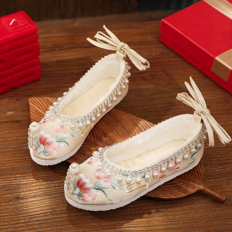 淘宝古色江南汉服鞋子女冬加绒平底古装香槟色绣花鞋中式秀禾婚鞋软底
