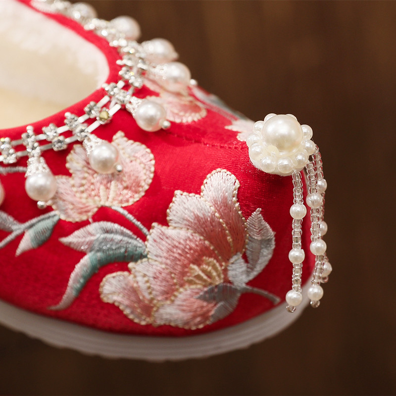 秋冬加绒秀禾服婚鞋中式女古风红色绣花棉鞋汉服鞋新娘结婚内增高