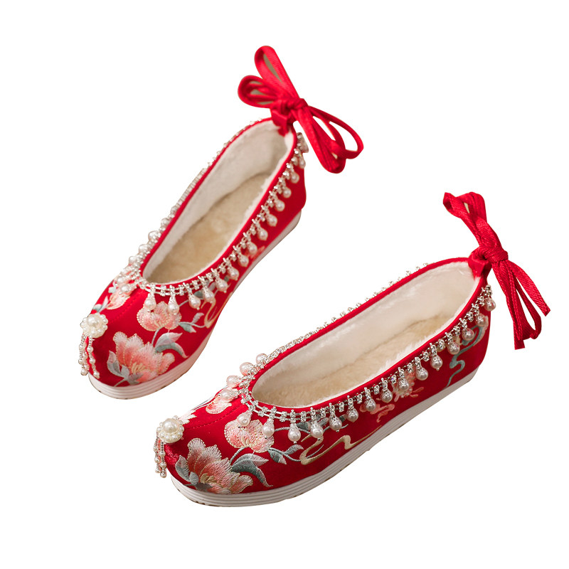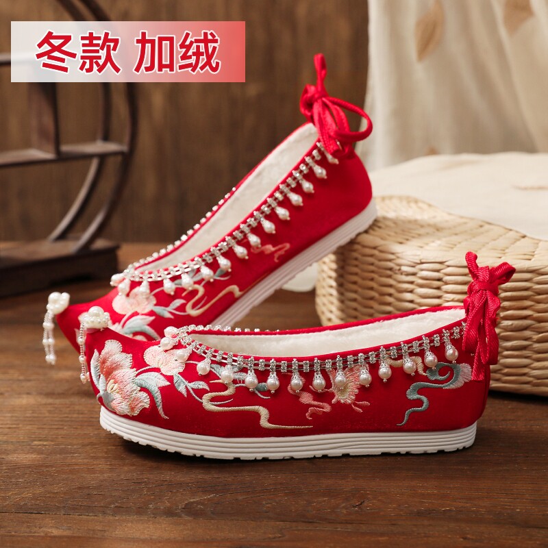 淘秋冬加绒秀禾服婚鞋中式女古风红色绣花棉鞋汉服鞋新娘结婚内增高