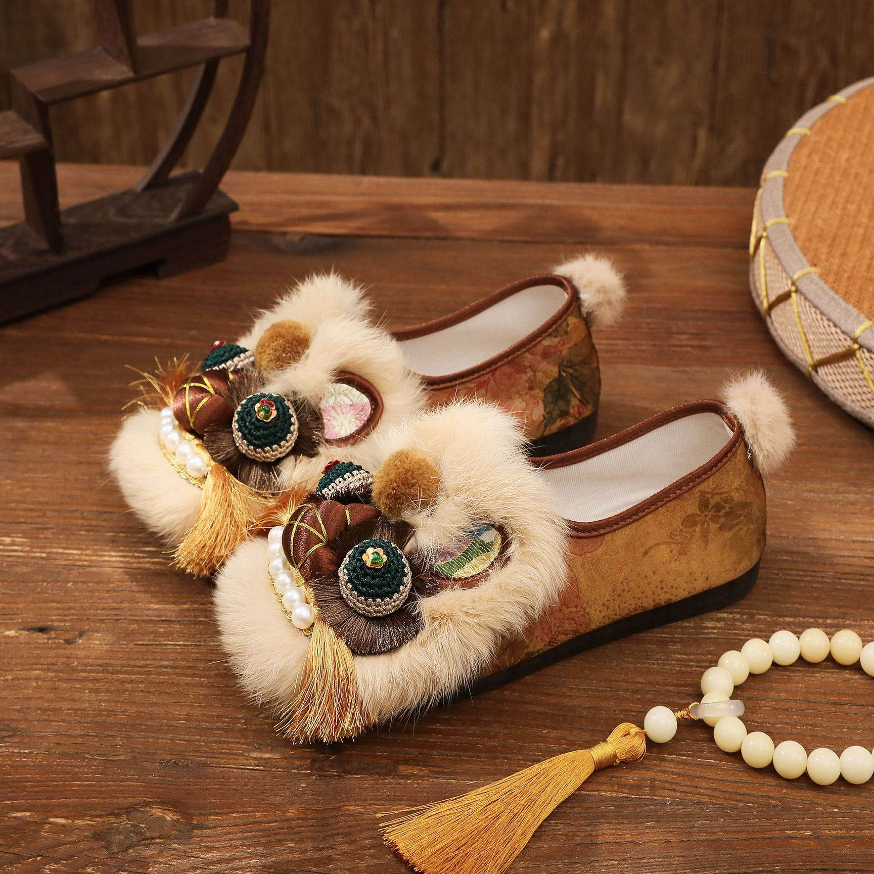 古色江南汉服鞋子女冬加绒平底古装香槟色绣花鞋中式秀禾婚鞋软底