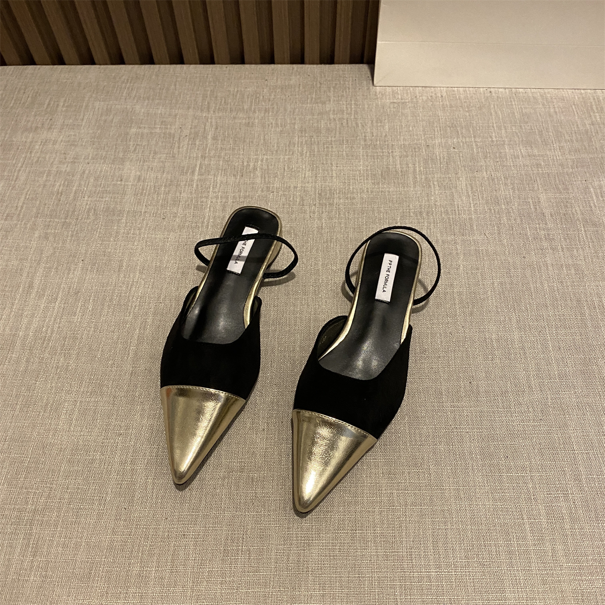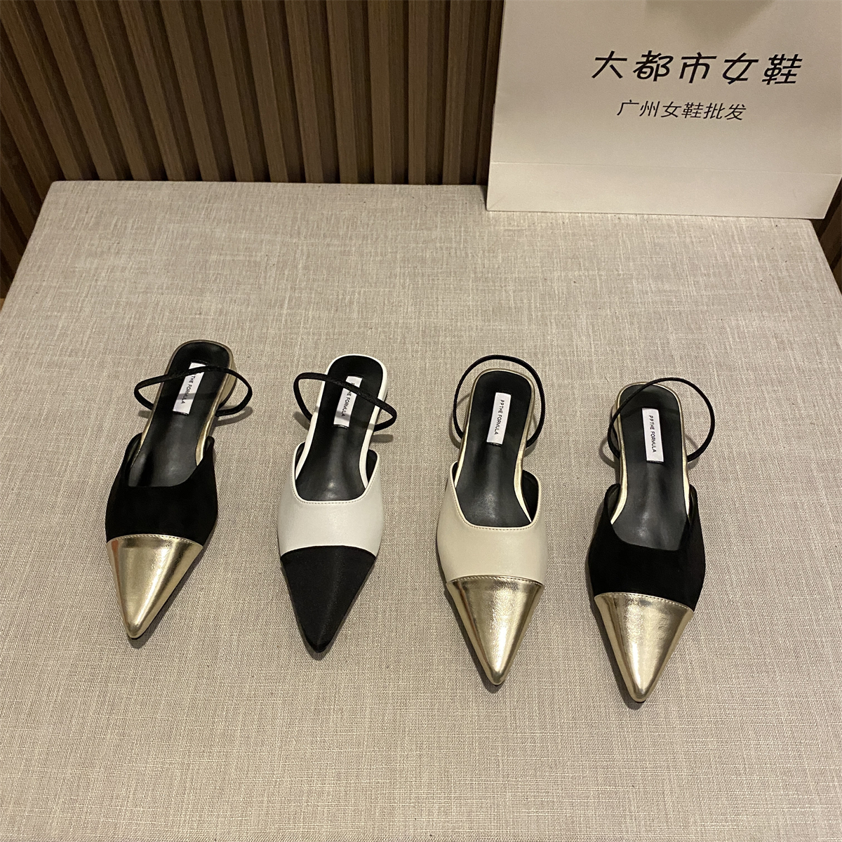 淘宝法式低跟小众包头拖鞋仙女鞋子2024年夏季新款拼色尖头小香风单鞋